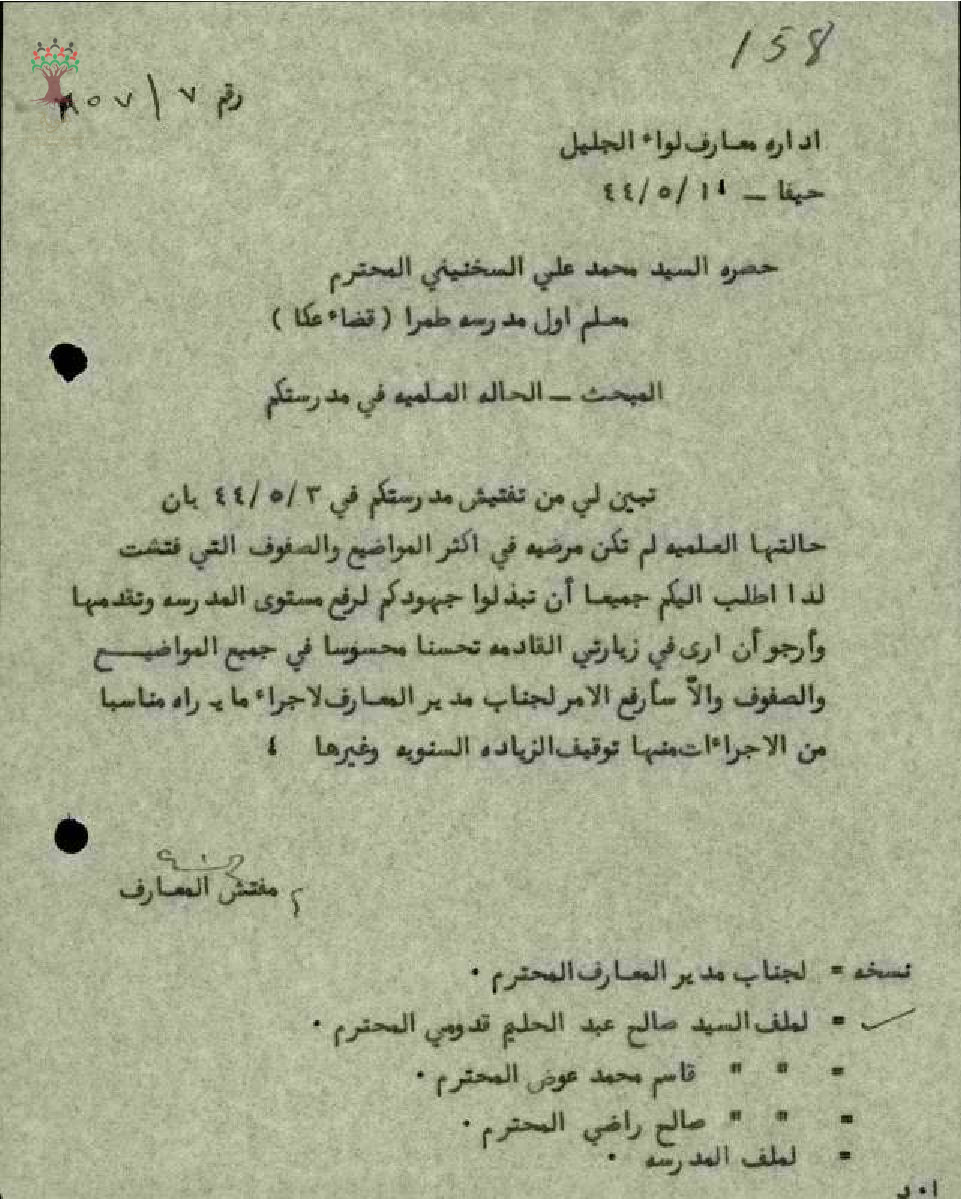 الحالة العلمية في مدرسة طمرة - رسالة من المفتش العام الى المعلم صالح القدومي - كفر قدوم