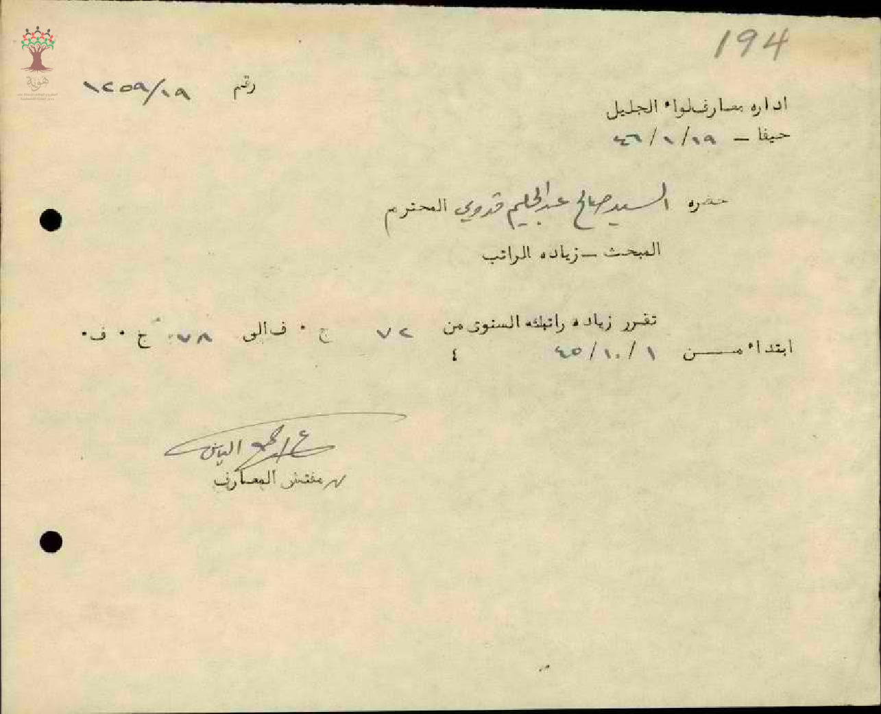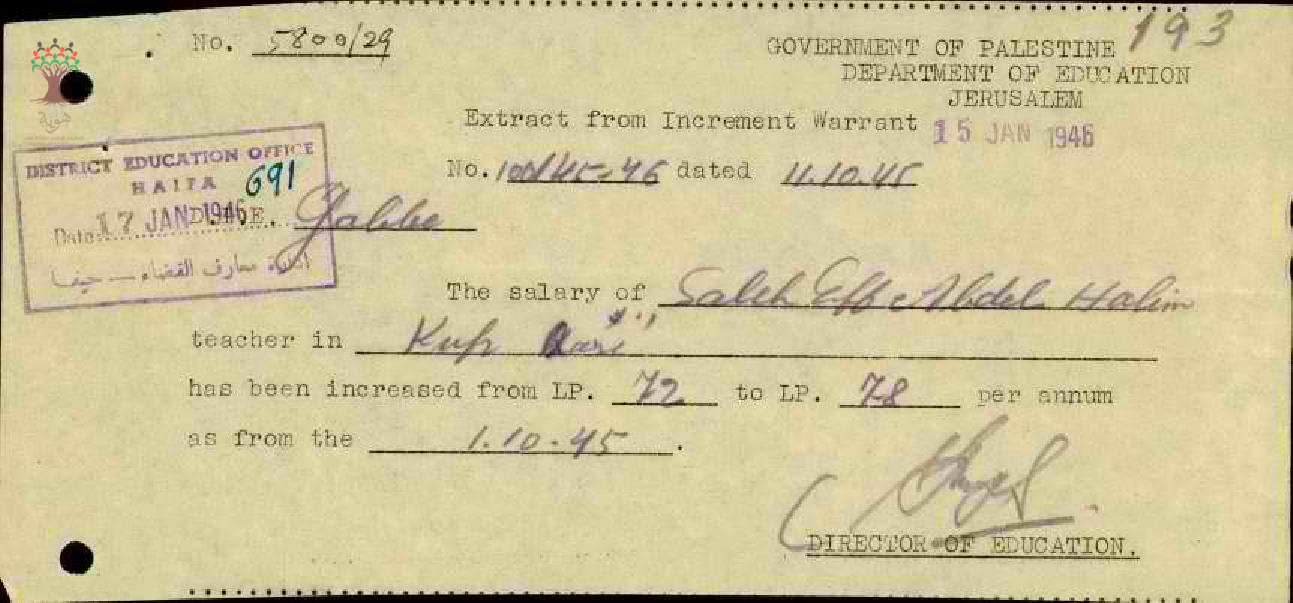 زيادة مرتب المعلم صالح عبد الحليم القدومي - كفر قدوم - مدرسة كفر فرع