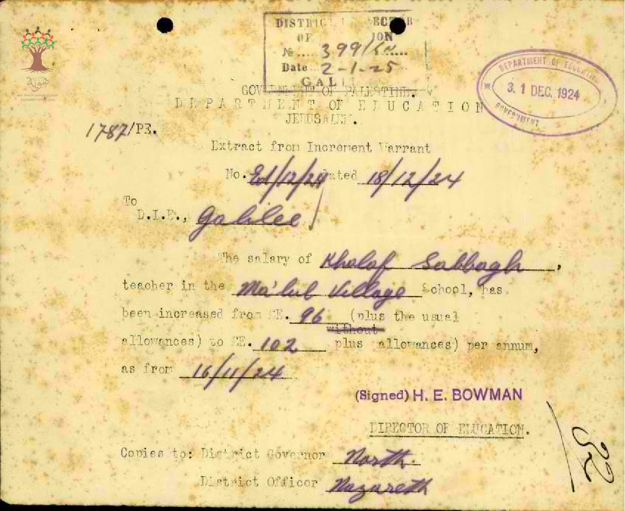 رسالة من مدير المعارف الى مفتش المعارف بخصوص زيادة راتب المعلم خلف صباغ السنوية