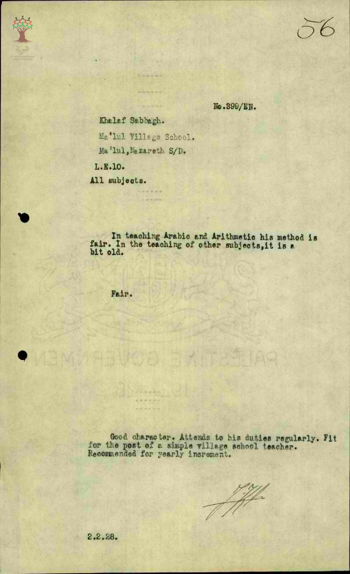 تقرير عن أداء المعلم خلف صباغ في مدرسة معلول سنة 1928