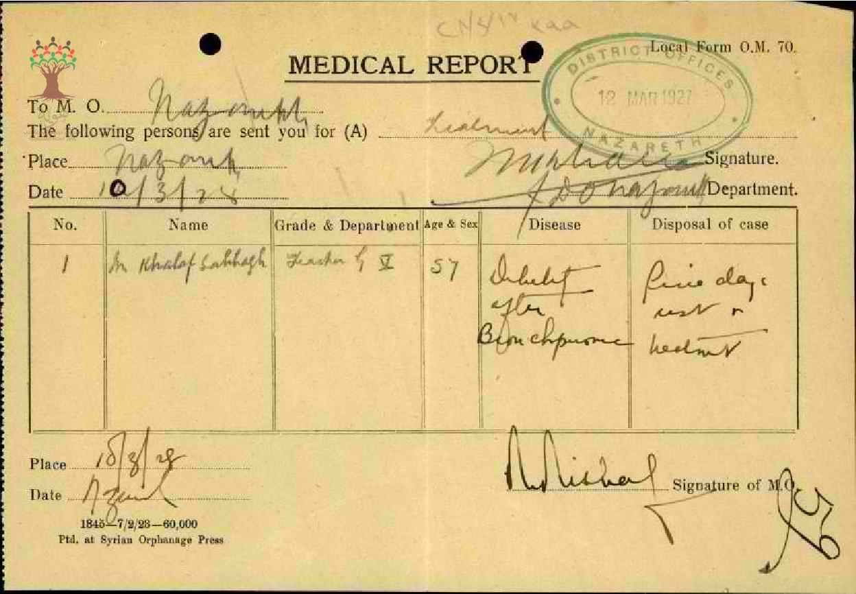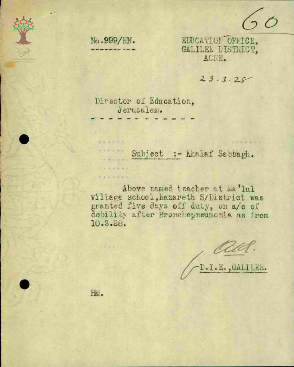 رسالة من مفتش المعارف الى مدير المعارف بخصوص اجازة مرضية للمعلم خلف صباغ مرفقة بالتقرير الطبي