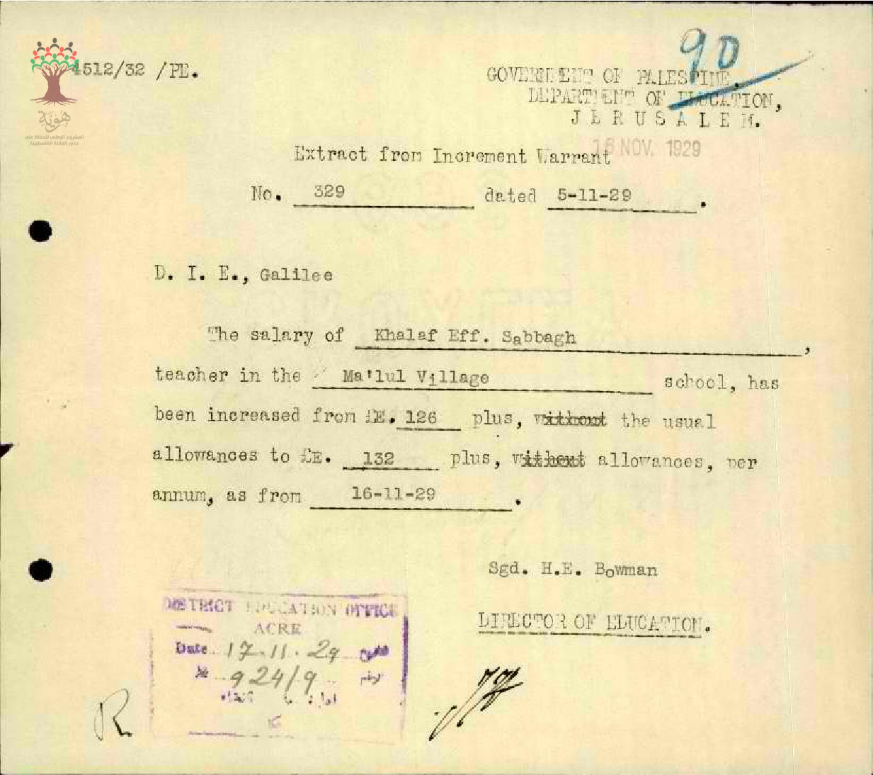 رسالة من مدير المعارف الى مفتش المعارف بخصوص زيادة راتب المعلم خلف صباغ السنوية
