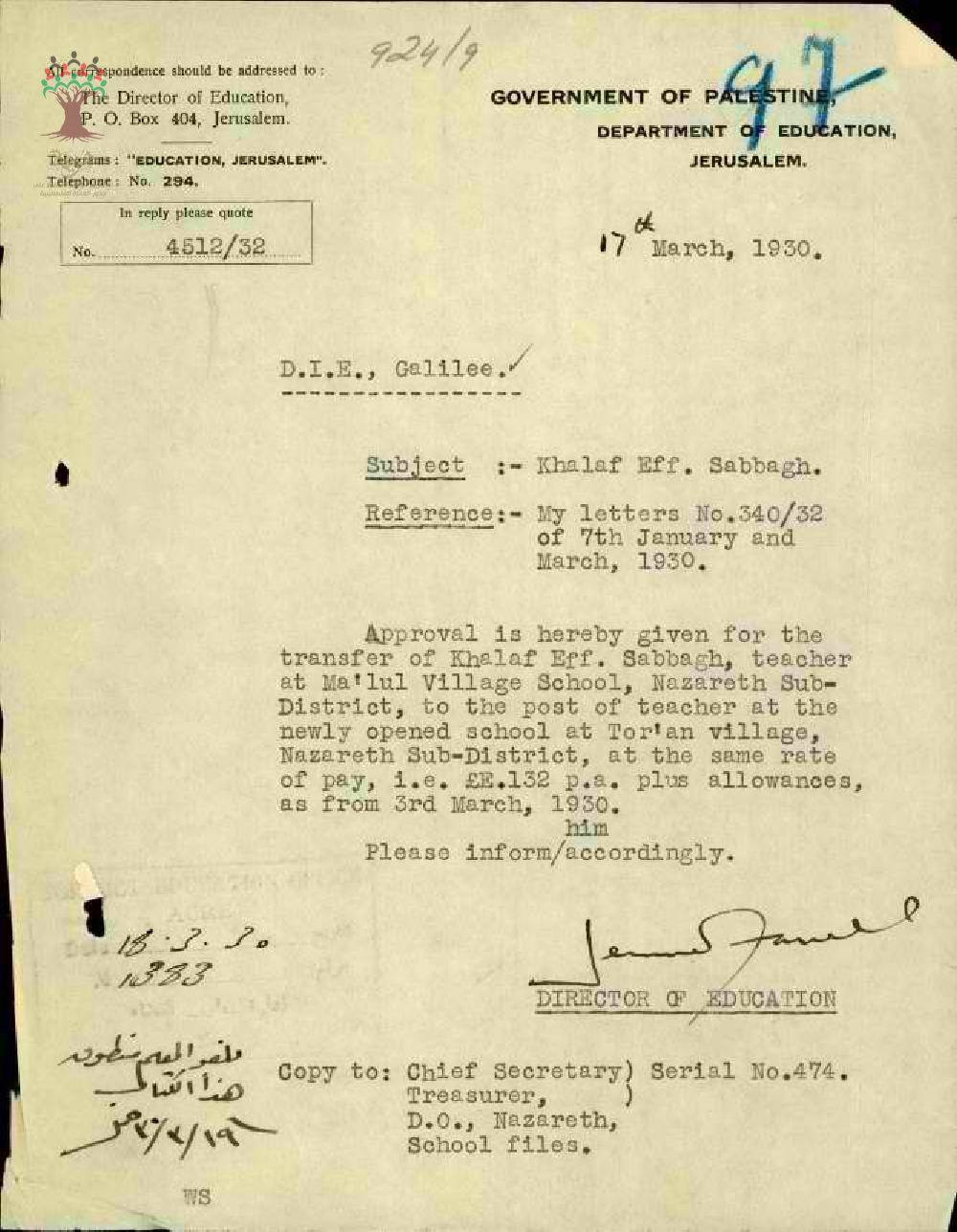 رسالة من مدير المعارف الى مفتش المعارف يوافق فيها على نقل المعلم خلف صباغ من مدرسة معلول الى مدرسة طرعان