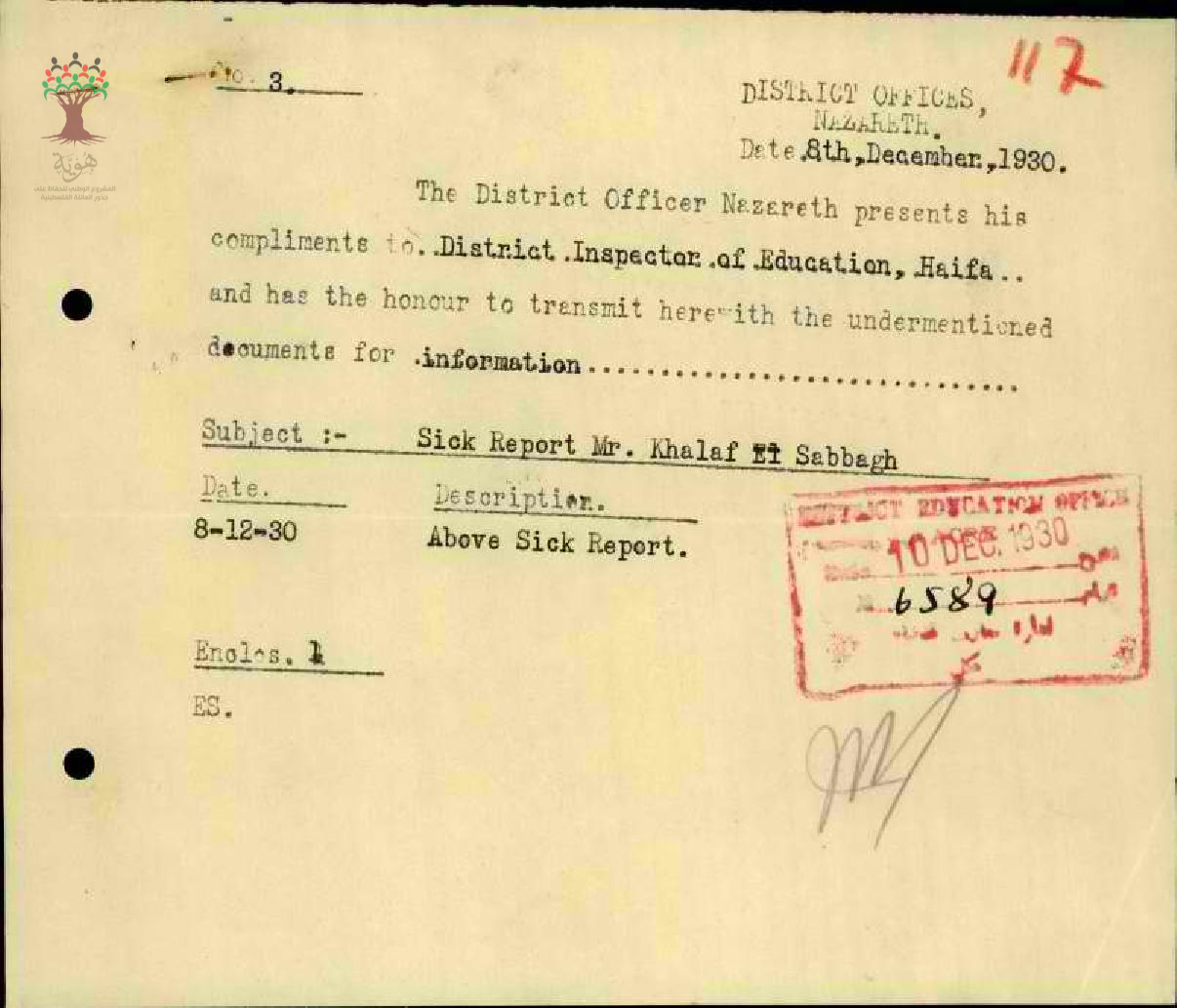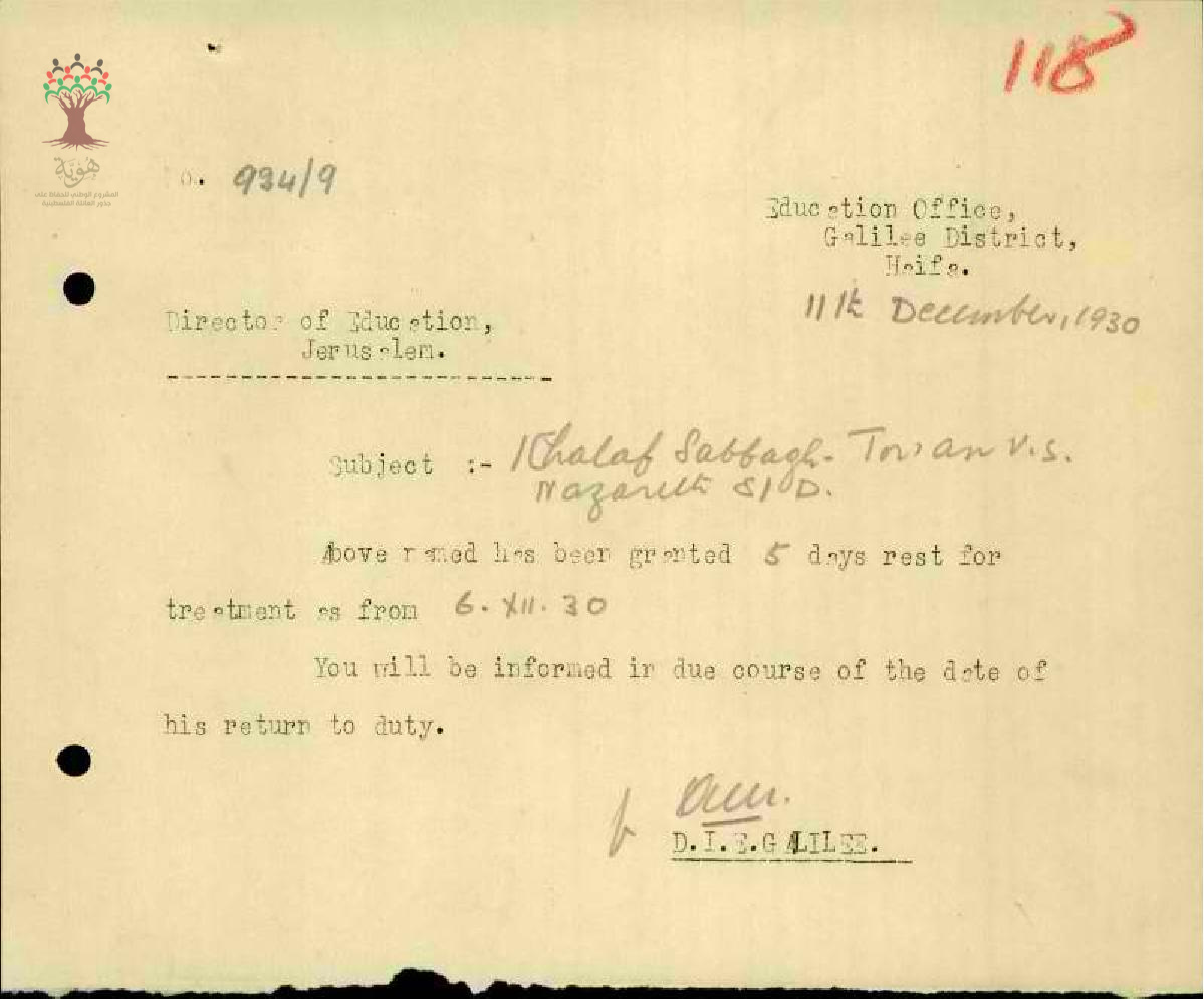 رسالة من مفتش المعارف الى مدير المعارف بخصوص اجازة مرضية للمعلم خلف صباغ مرفقة بالتقرير الطبي