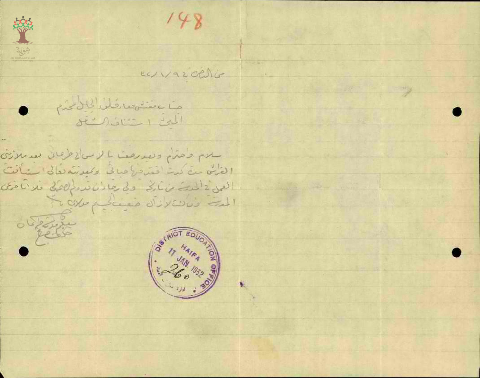 رسالة من المعلم خلف صباغ الى مفتش المعارف يخبره بأنه قد عاد الى العمل