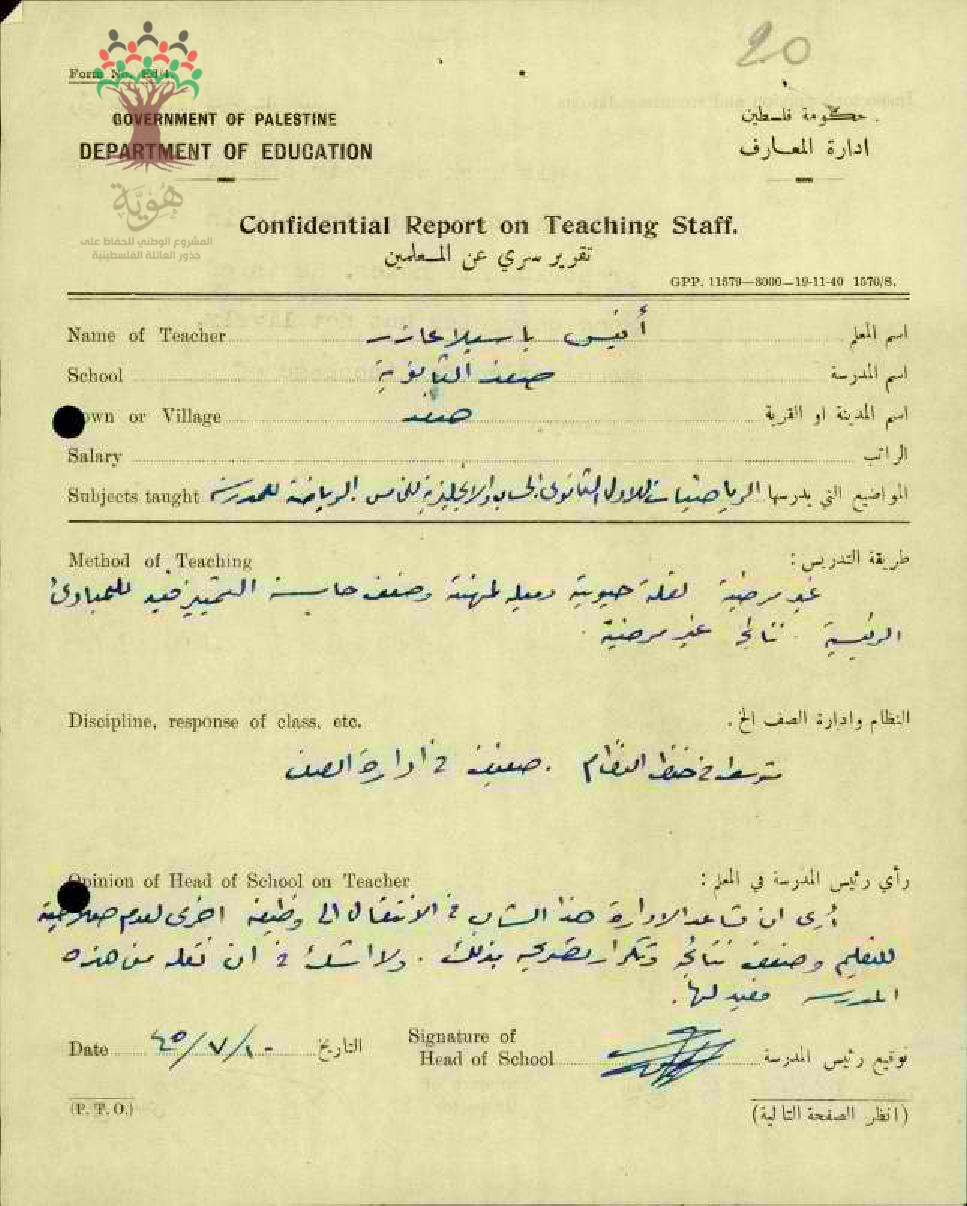 تقرير تفصيلي للمعلم انيس باسيلا عازار حداد من قبل مدير مدرسة صفد 3