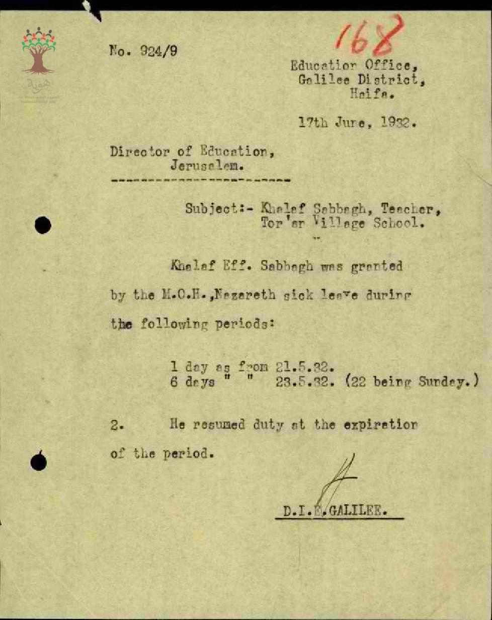 رسالة من مفتش المعارف الى مدير المعارف بخصوص اجازة مرضية للمعلم خلف صباغ وعودته للعمل