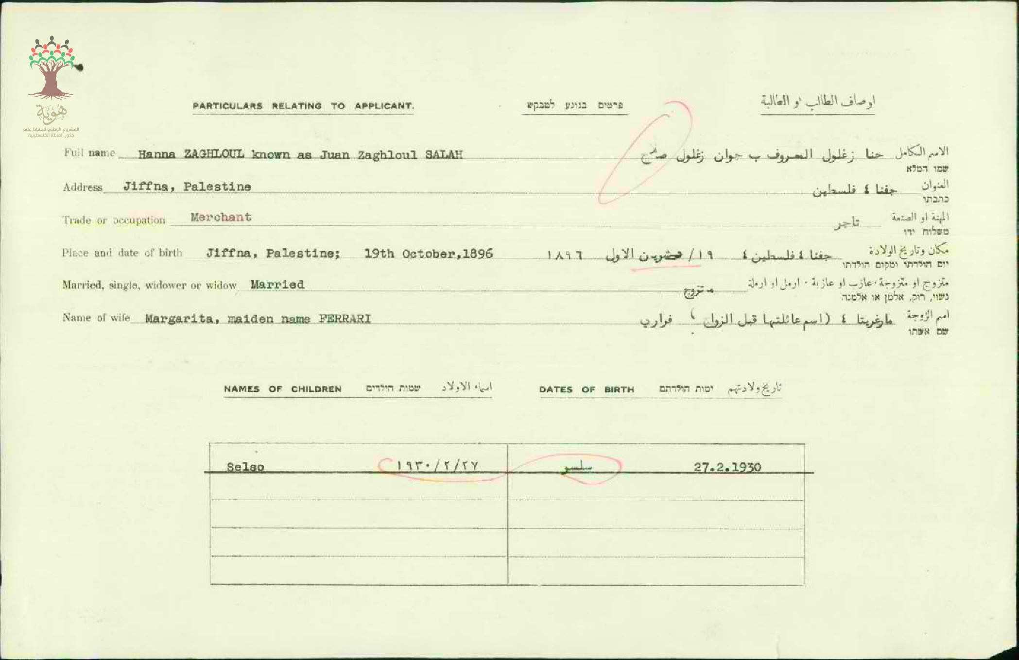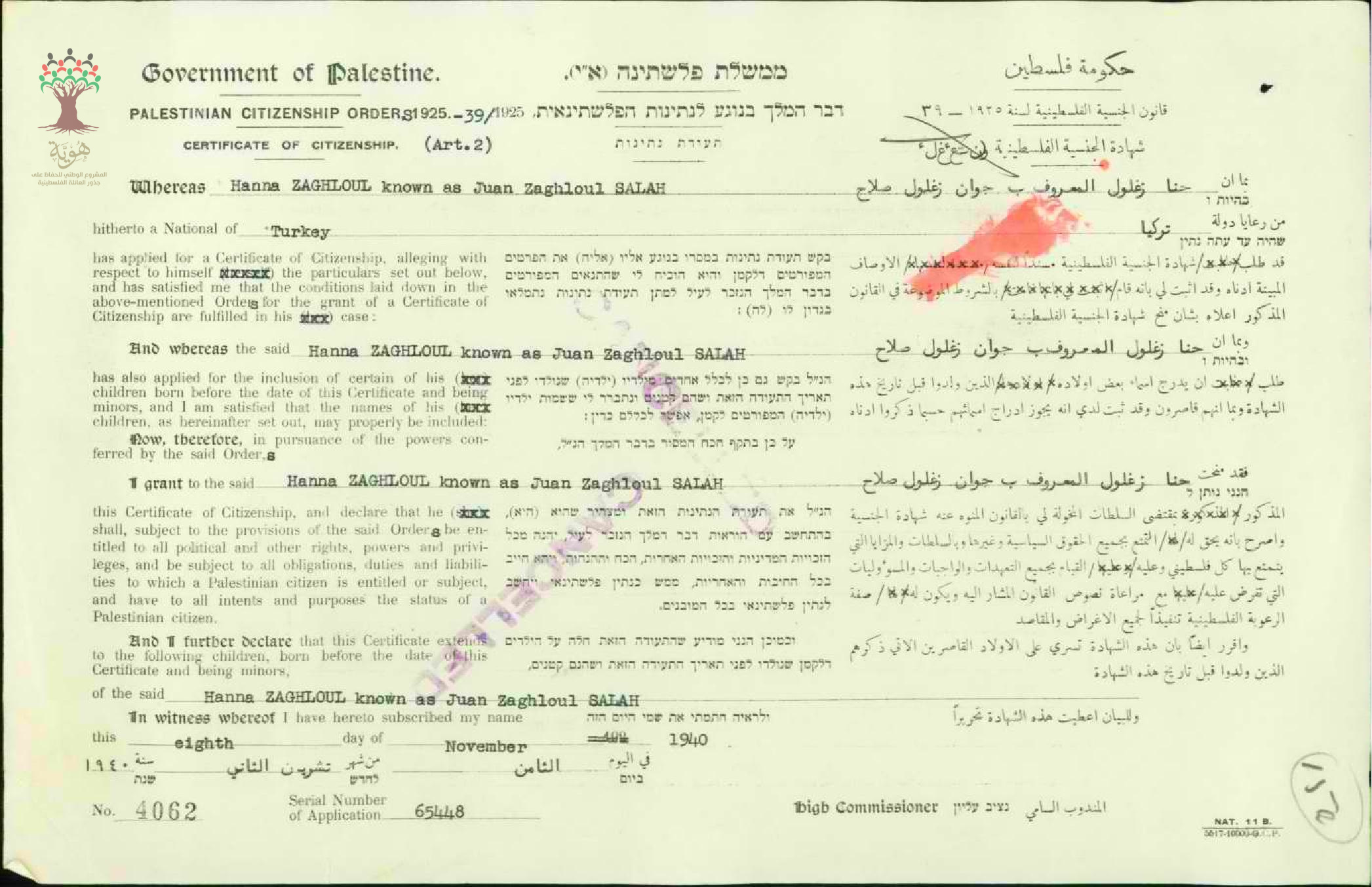 شهادة الجنسية الفلسطينية لحنا زغلول صلاح
