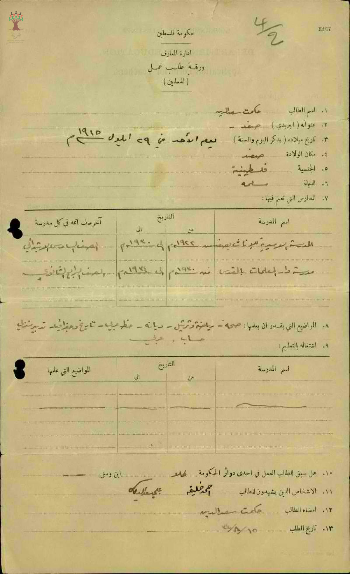 طلب عمل مقدمة من المعلم حكمت سعد الدين - صفد - مدرسة صفد