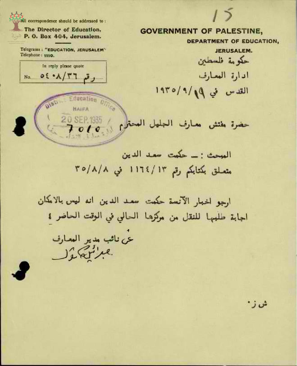 رفض طلب النقل المقدم من قبل المعلمة حكمت سعد الدين - صفد - مدرسة صفد