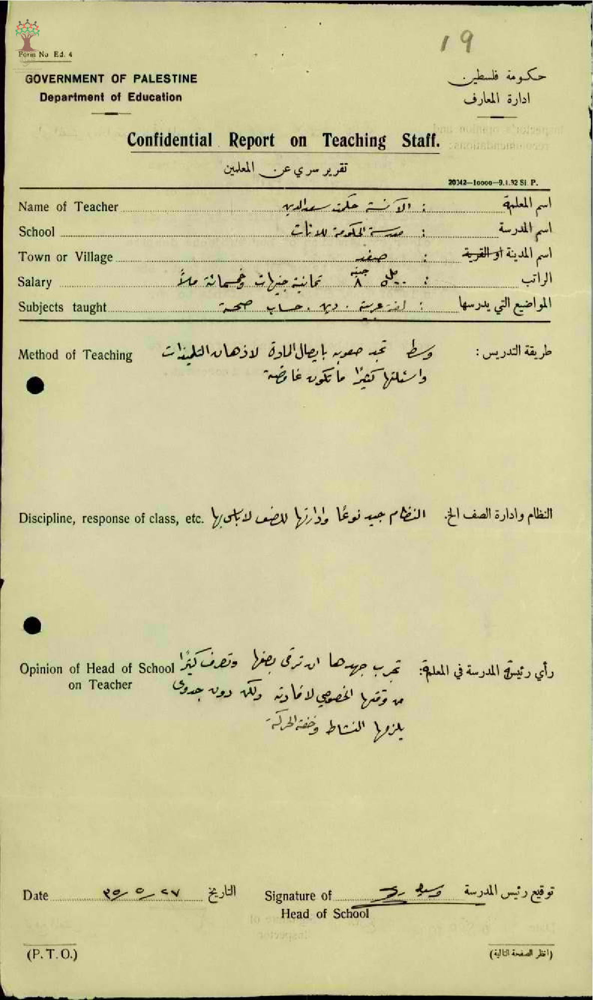رأي مدير مدرسة صفد بالمعلمة المعلمة حكمت سعد الدين - صفد - مدرسة صفد