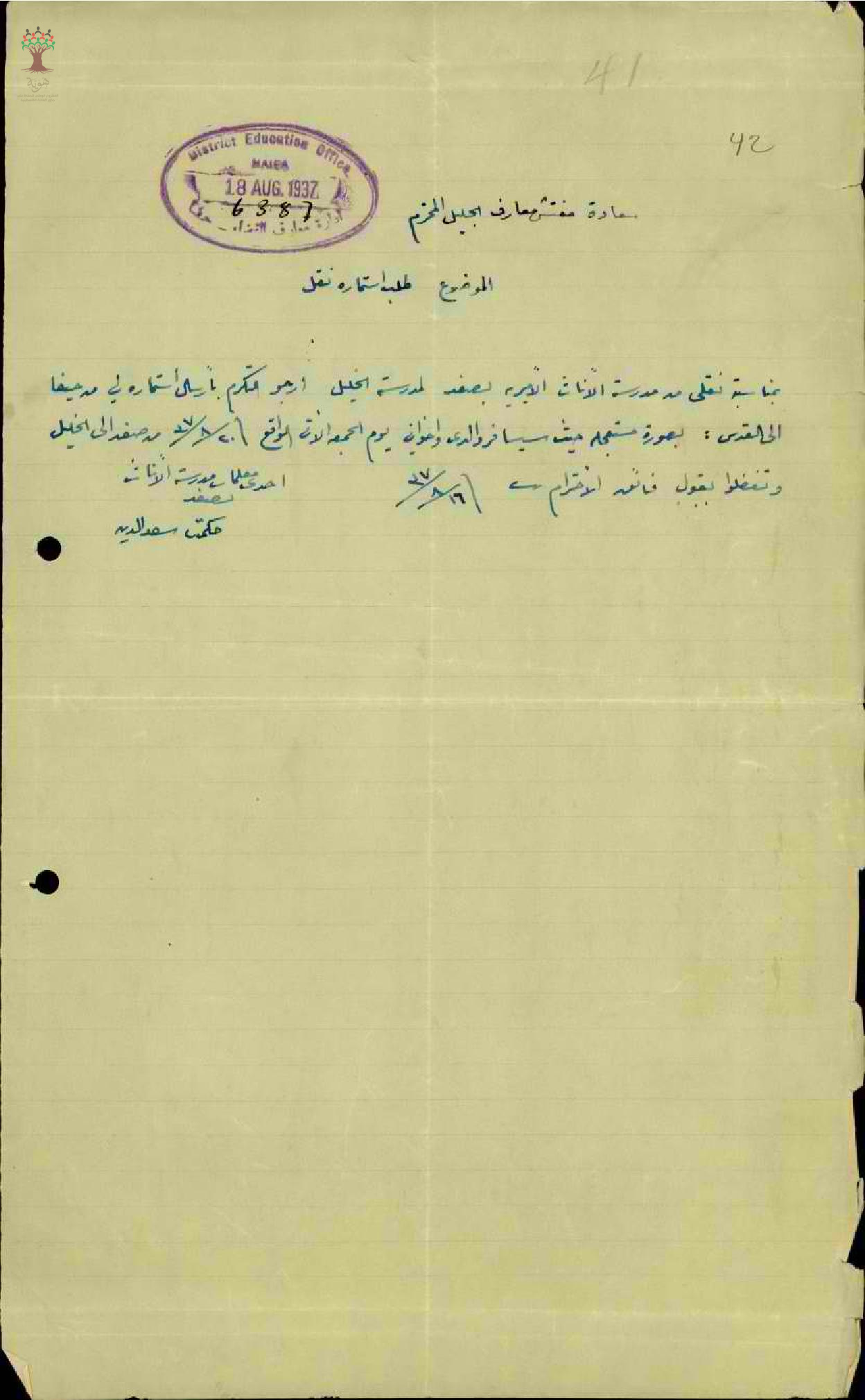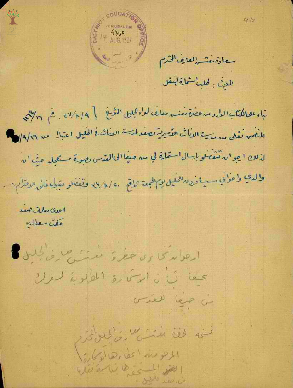 استمارة سفر من حيفا الى القدس المعلمة حكمت سعد الدين - صفد - مدرسة صفد