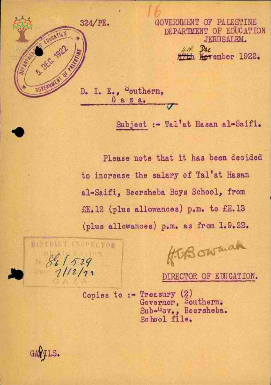 رسالة من مدير المعارف الى مفتش المعارف بخصوص زيادة راتب المعلم طلعت السيفي السنوية