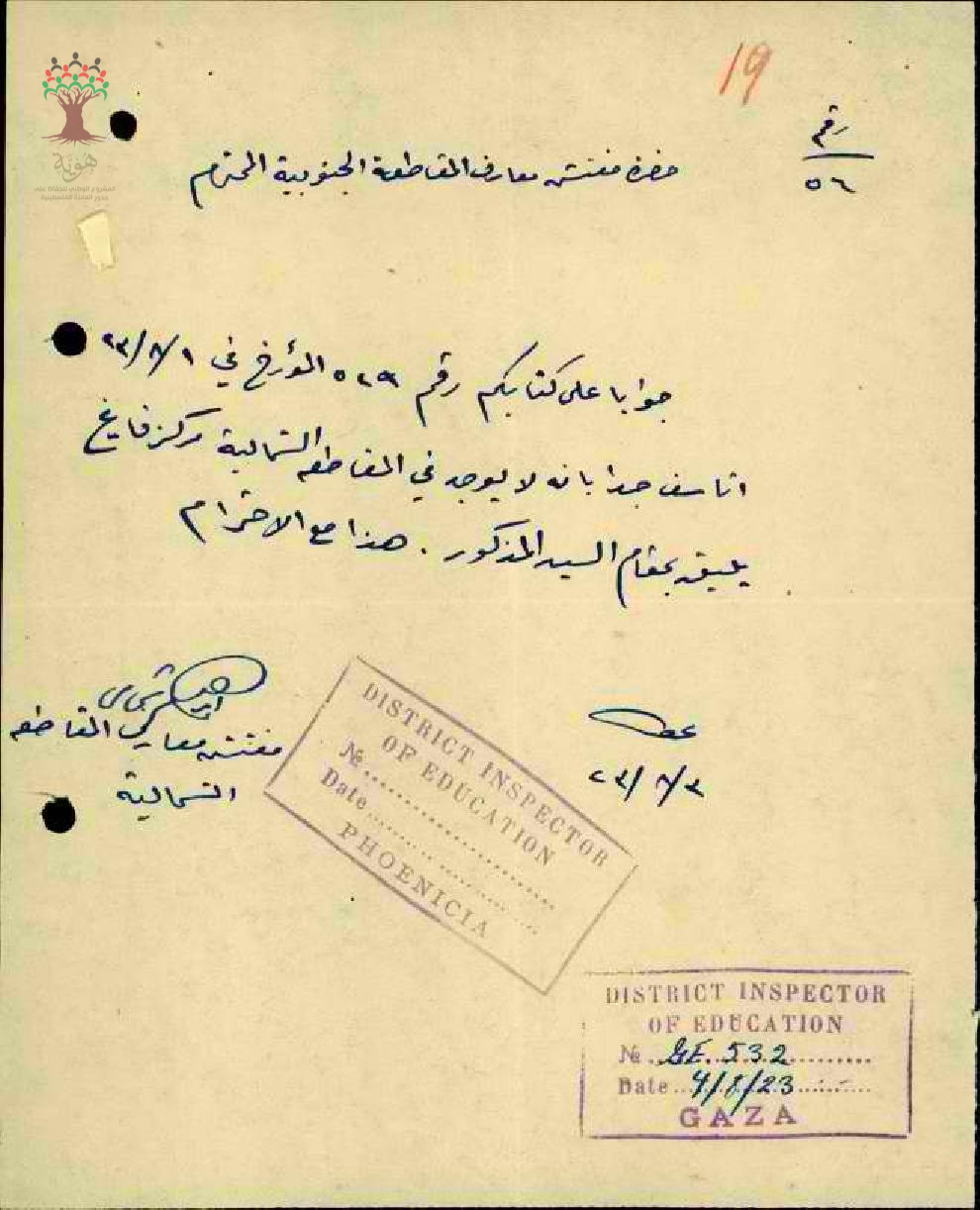 رسالة من مفتش المعارف المقاطعة الشمالية الى مفتش معارف المقاطعة الجنوبية يخبره بأنه لا يوجد شاغر لنقل المعلم طلعت السيفي
