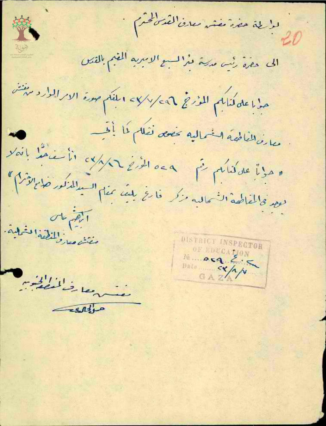 رسالة من مفتش المعارف الى المعلم طلعت السيفي يخبره بأنه لا يوجد شاغر لنقله الى عكا