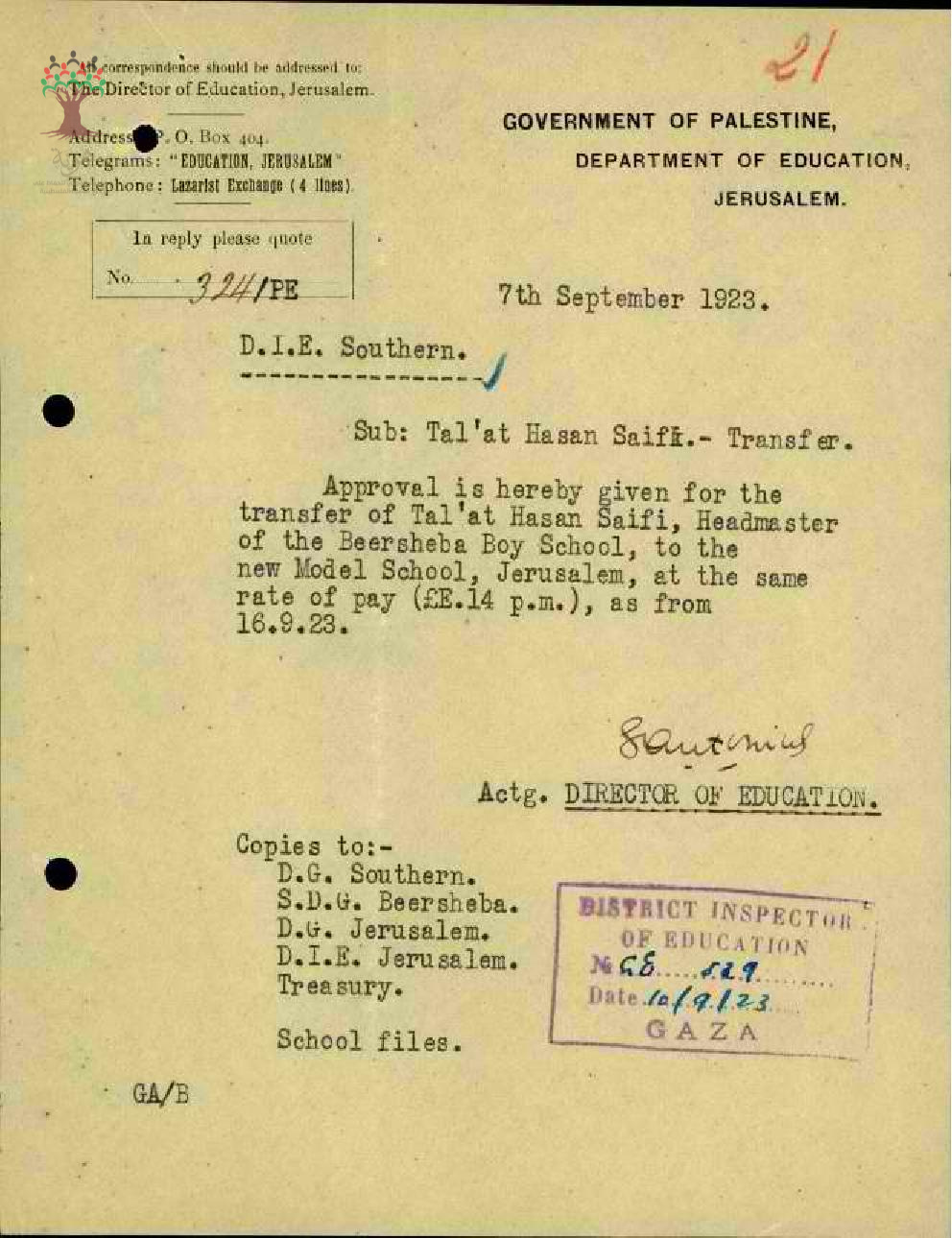 رسالة من مدير المعارف الى مفتش المعارف بخصوص نقل المعلم طلعت السيفي من مدرسة بئر السبع الى القدس