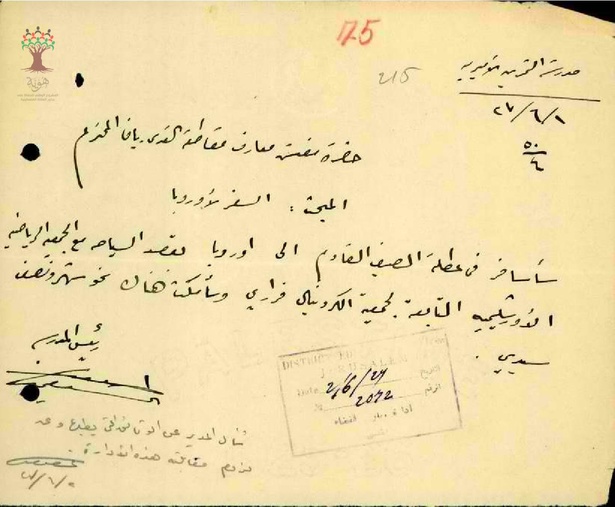 رسالة من المعلم طلعت السيفي الى مفتش المعارف يطلب الاذن بالسفر الى مصر في عطلة الصيف