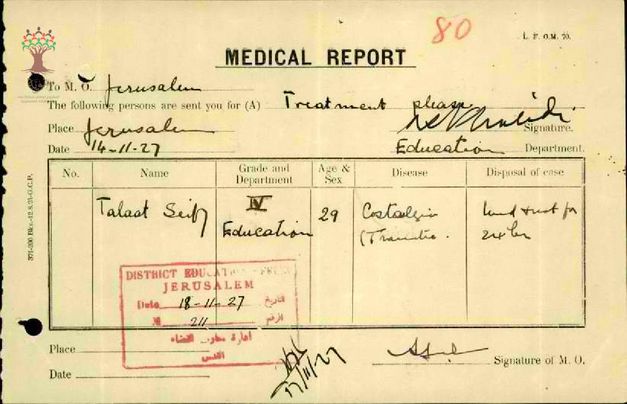 تقرير طبي عن غياب المعلم طلعت السيفي-مدرسة التمرين/القدس