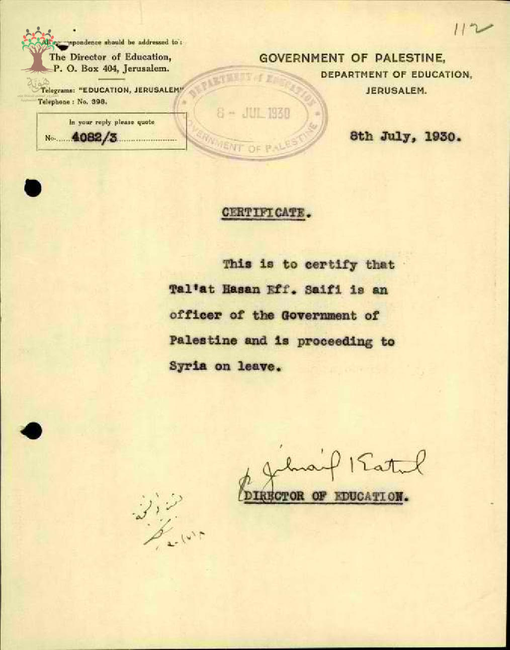 رسالة من مدير المعارف الى رئيس السكرتارية يخبره بأن المعلم طلعت السيفي سيغادر الى سوريا