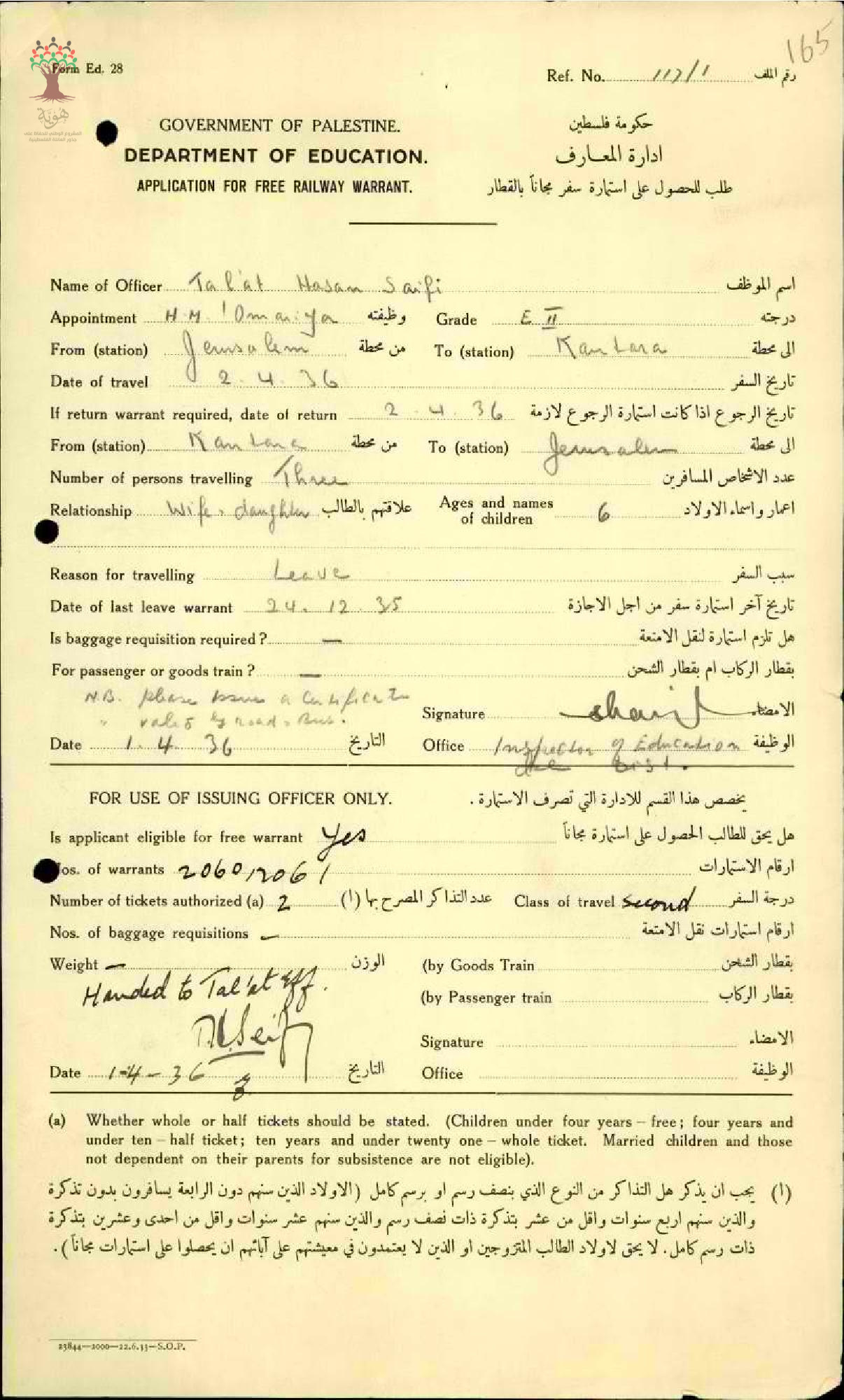 طلب استمارة سفر مقدمة من المعلم طلعت السيفي/القدس