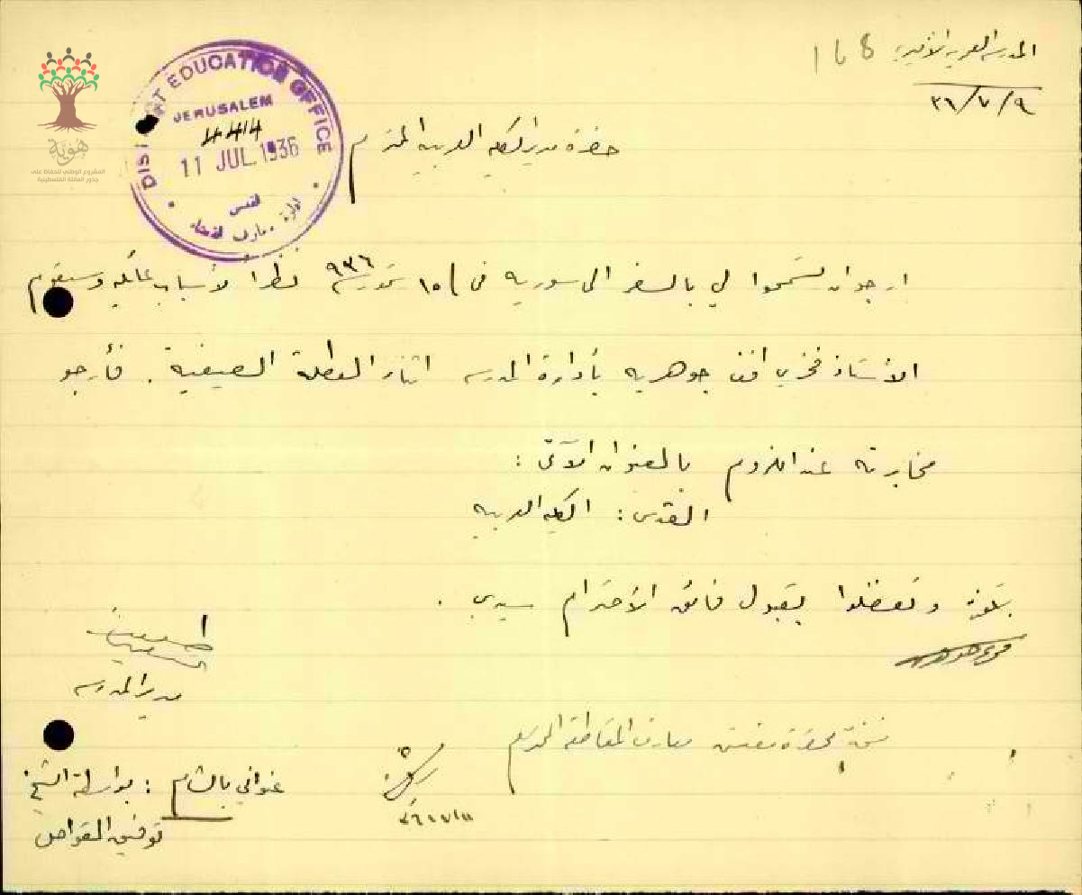 رسالة من المعلم طلعت السيفي الى مدير الكلية العربية يطلب الاذن بالسفر الى سوريا في عطلة الصيف