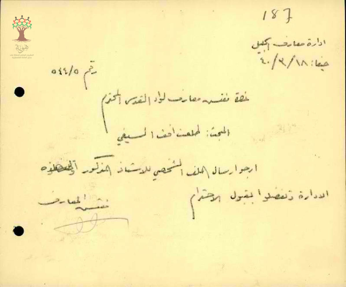 رسالة من مفتش المعارف الى مفتش معارف لواء القدس يطلب فيها الملف الشخصي للمعلم طلعت السيفي