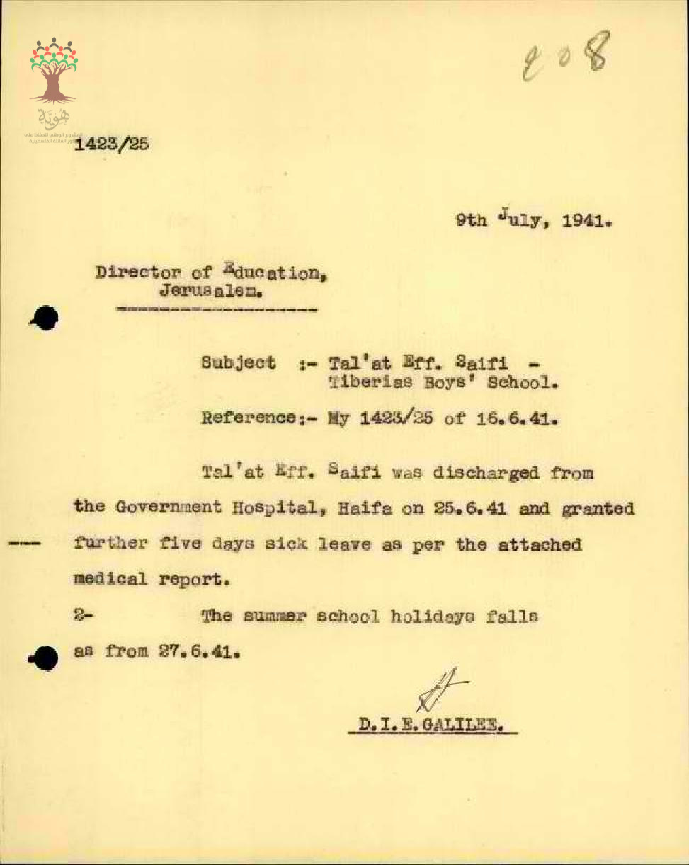 رسالة من مفتش المعارف الى مدير المعارف بخصوص اجازة مرضية للمعلم طلعت السيفي