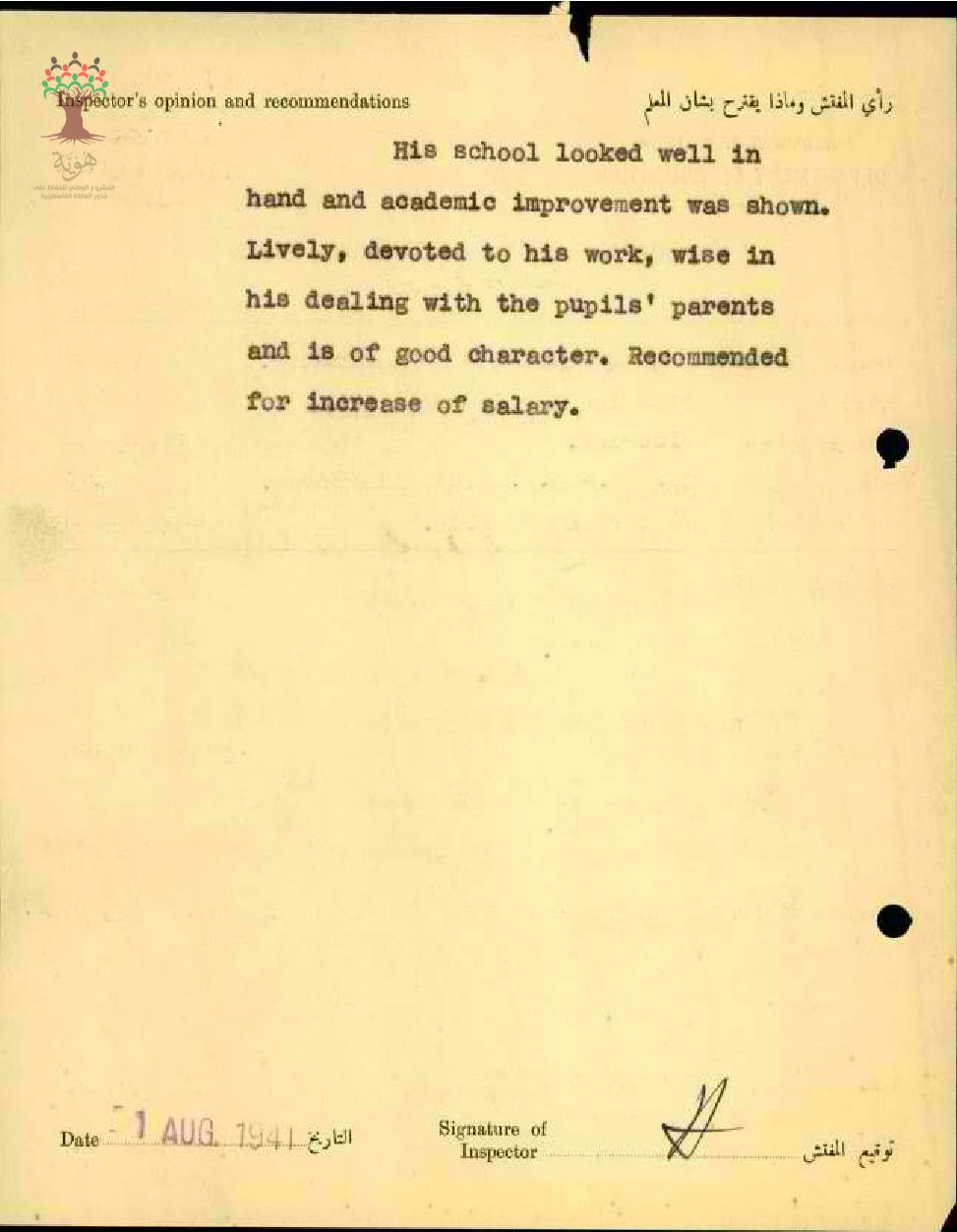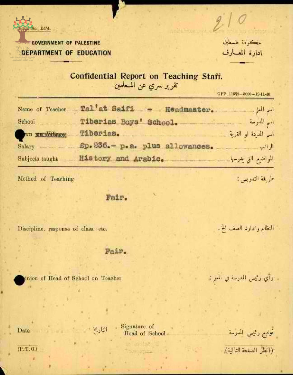 تقرير تفصيلي عن أداء المعلم طلعت السيفي في مدرسة ذكور طبريا سنة 1941