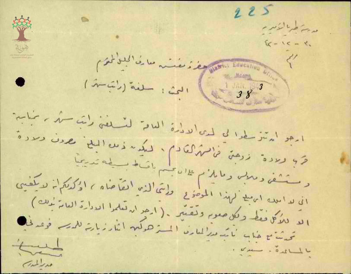 رسالة من المعلم طلعت السيفي الى مفتش المعارف يطلب فيها سلفة على راتبه بسبب قرب موعد ولادة زوجته