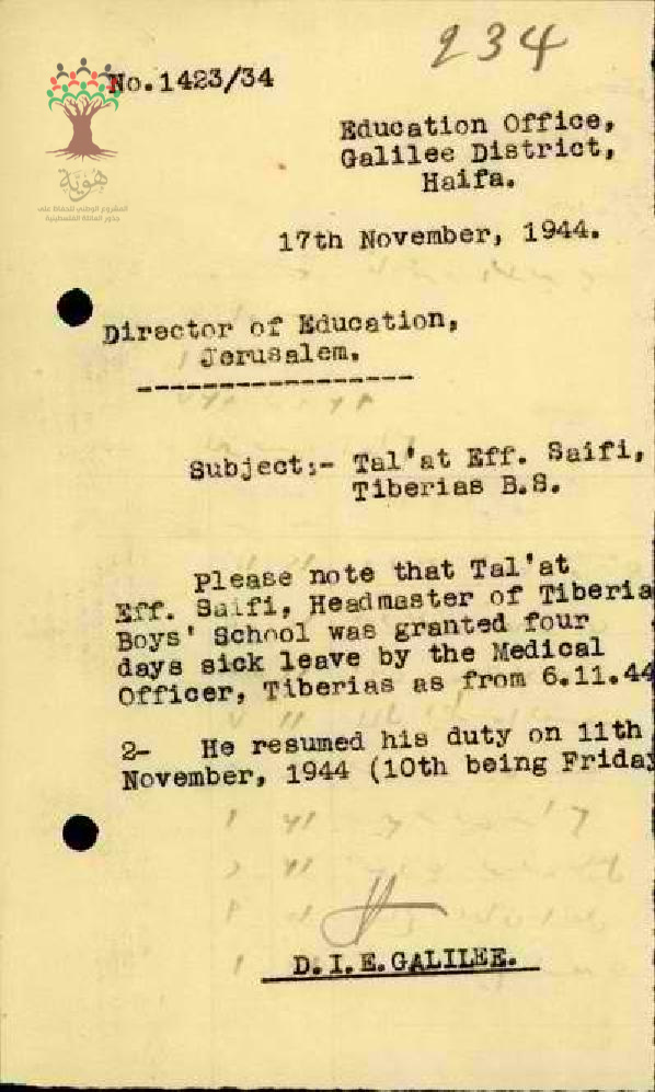 رسالة من مفتش المعارف الى مدير المعارف بخصوص اجازة مرضية للمعلم طلعت السيفي وعودته للعمل