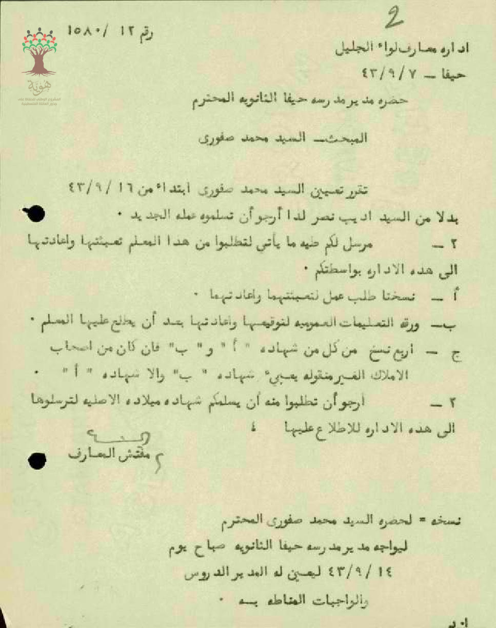 تعيين المعلم محمد حسن صفوري في ثانوية حيفا
