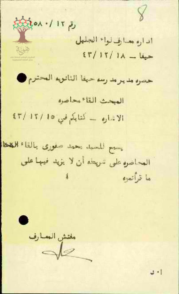 رسالة من مفتش المعارف الى مدير مدرسة حيفا بخصوص القاء المعلم محمد صفري محاضرة
