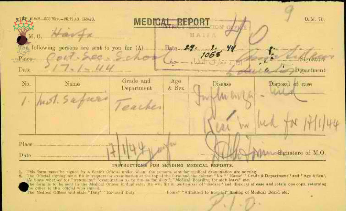تقرير طبي عن غياب المعلم محمد حسن صفوري-مدرسة حيفا