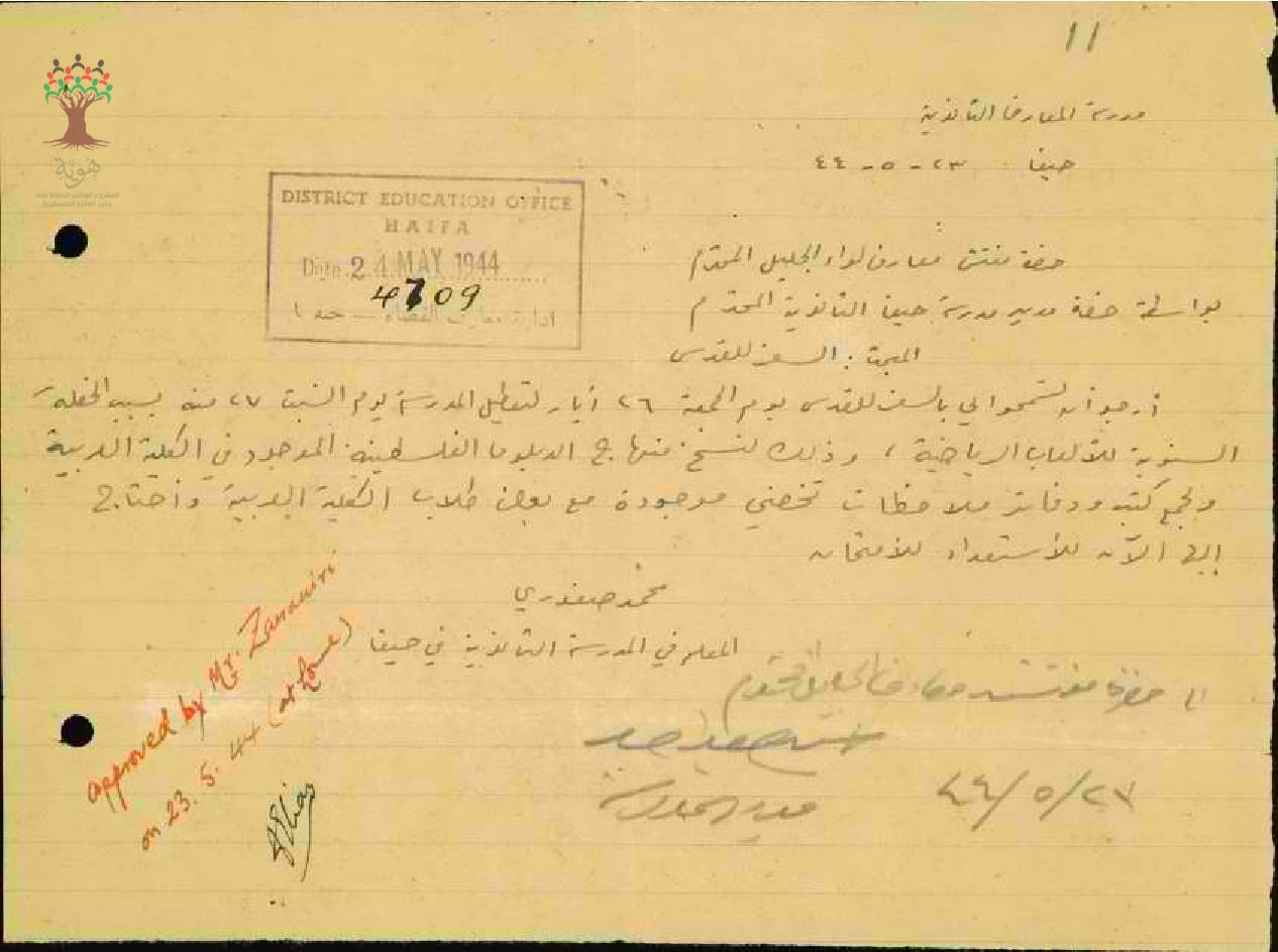 رسالة من المعلم محمد صفوري الى مفتش المعارف يطلب الاذن بالتغيب عن المدرسة لحصور حفل الألعاب الرياضية