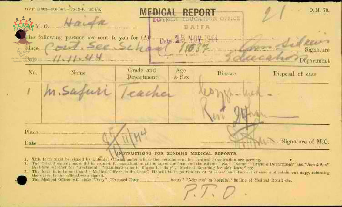 تقرير طبي عن غياب المعلم محمد حسن صفوري-مدرسة حيفا