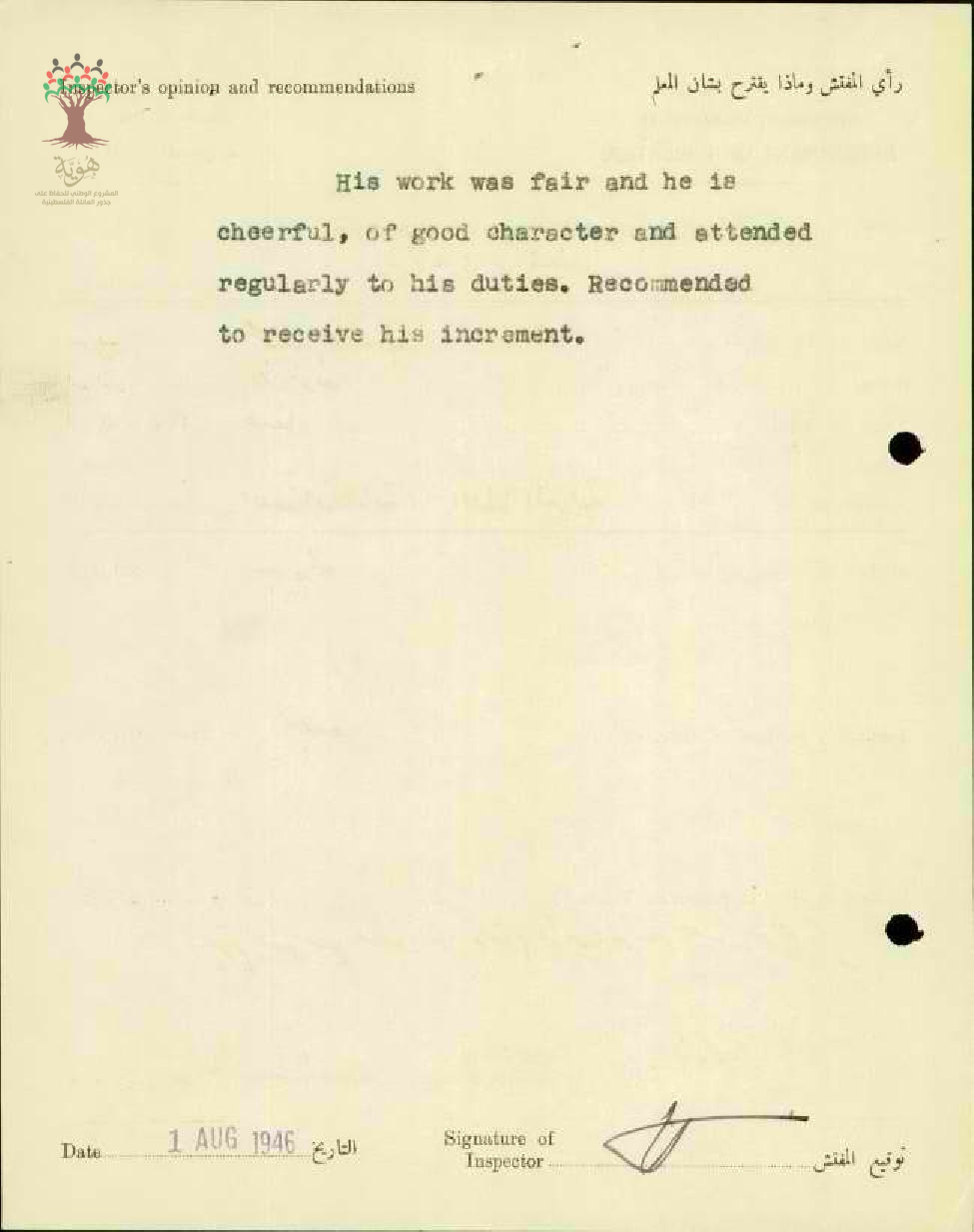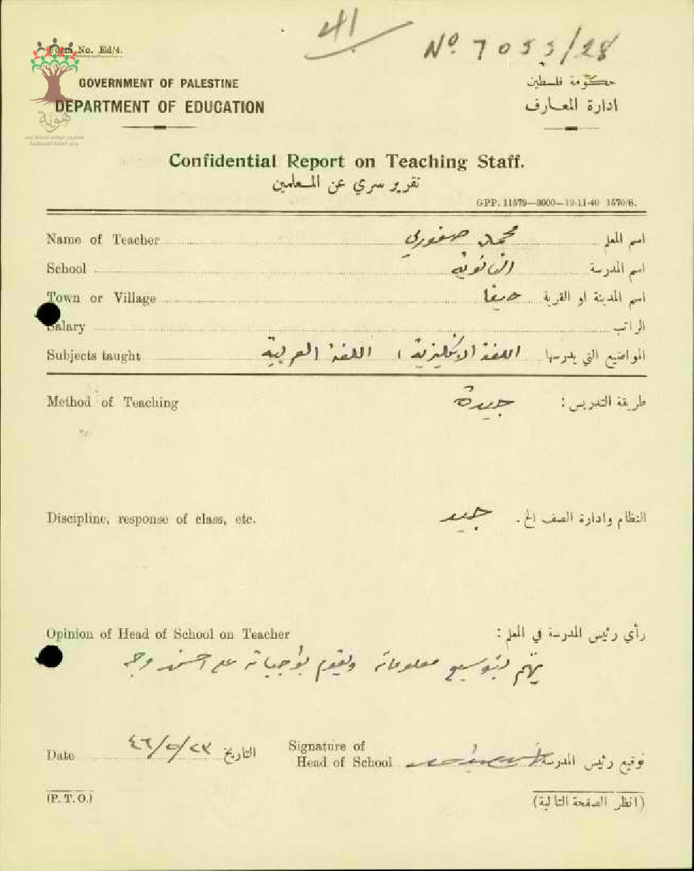 تقرير تفصيلي عن أداء المعلم محمد حسن صفوري في مدرسة حيفا سنة 1946