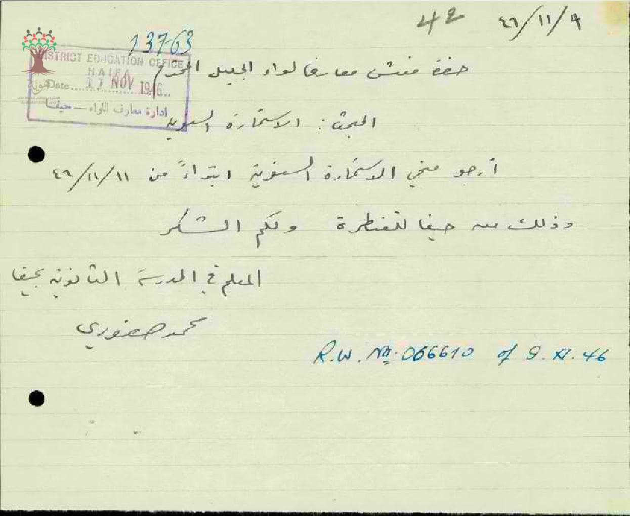 رسالة من المعلم محمد صفوري الى مفتش المعارف يطلب فيها استمارته السنوية