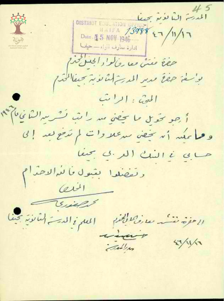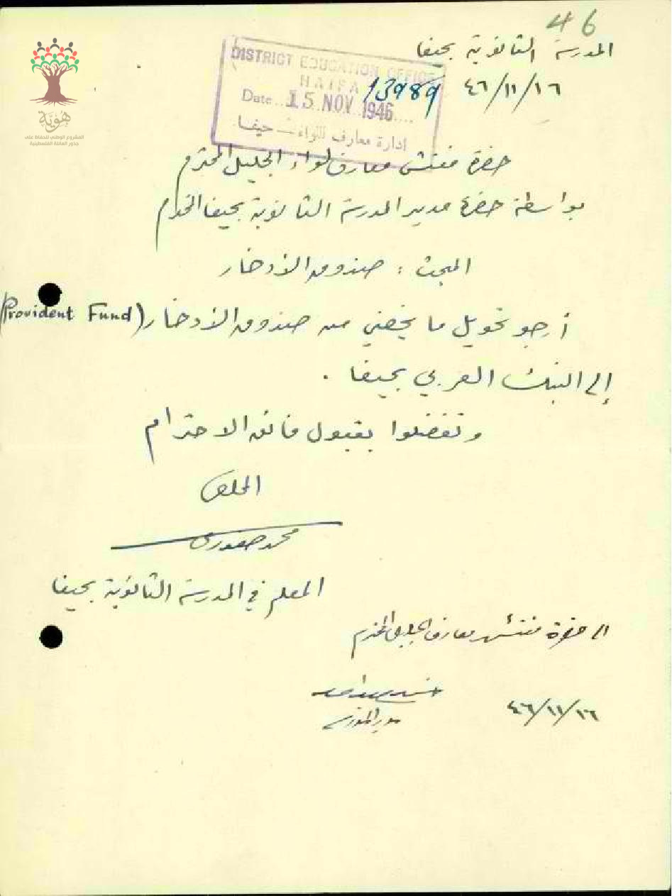 رسائل من المعلم محمد صفوري الى مفتش المعارف بخصوص تحويل راتبه ومدخراته في صندوق الاحتياط