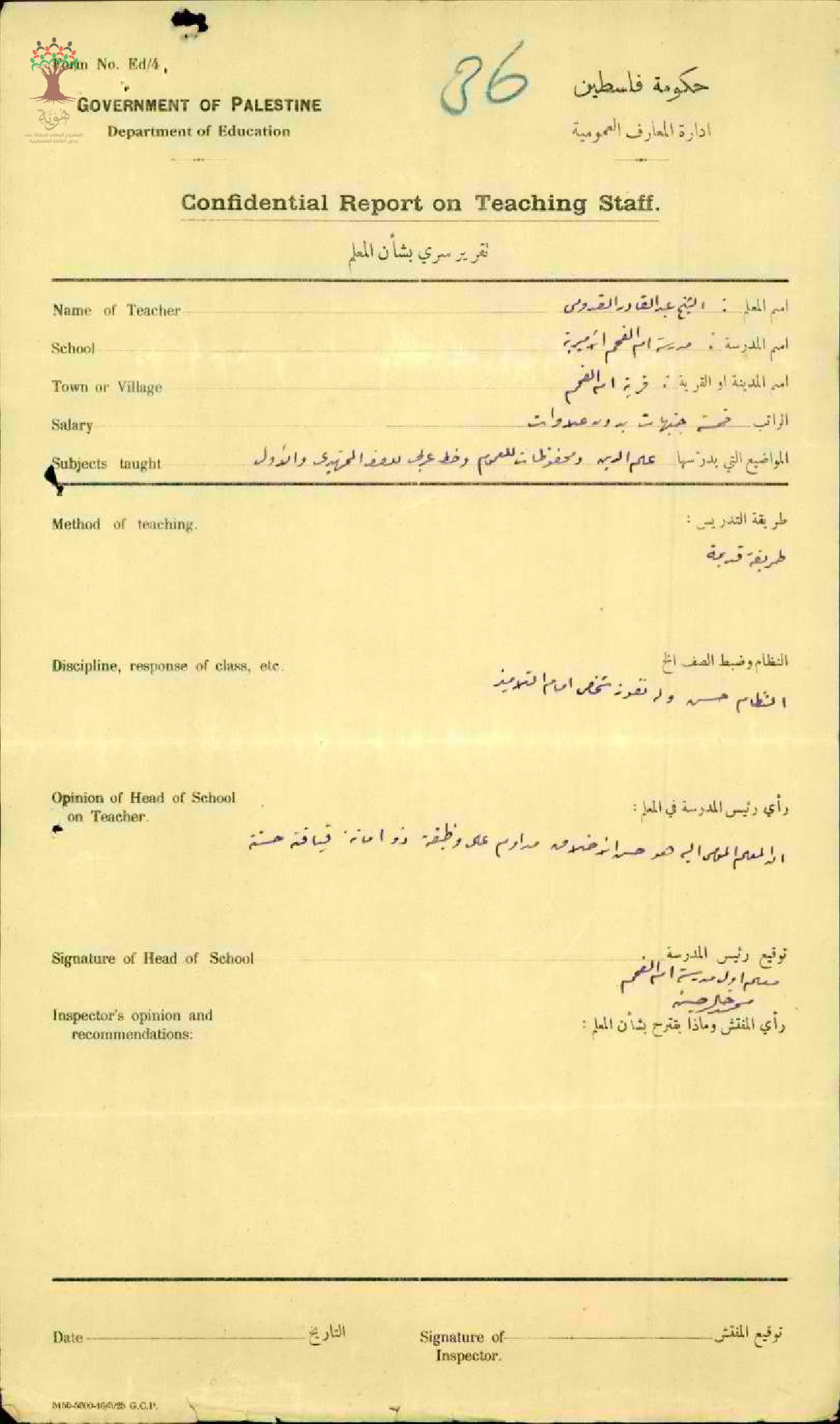 تقرير تفصيلي عن أداء المعلم عبد القادر قدومي في مدرسة أم الفحم