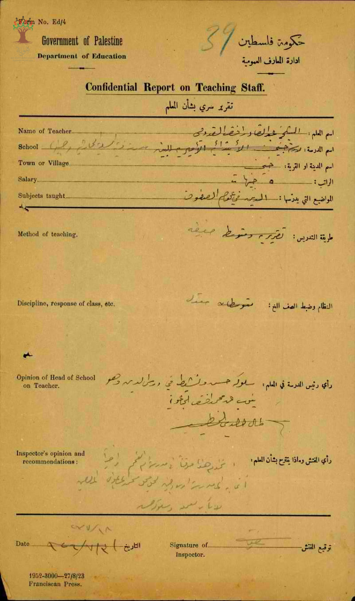 تقرير تفصيلي عن أداء المعلم عبد القادر قدومي في مدرسة جنين سنة 1926