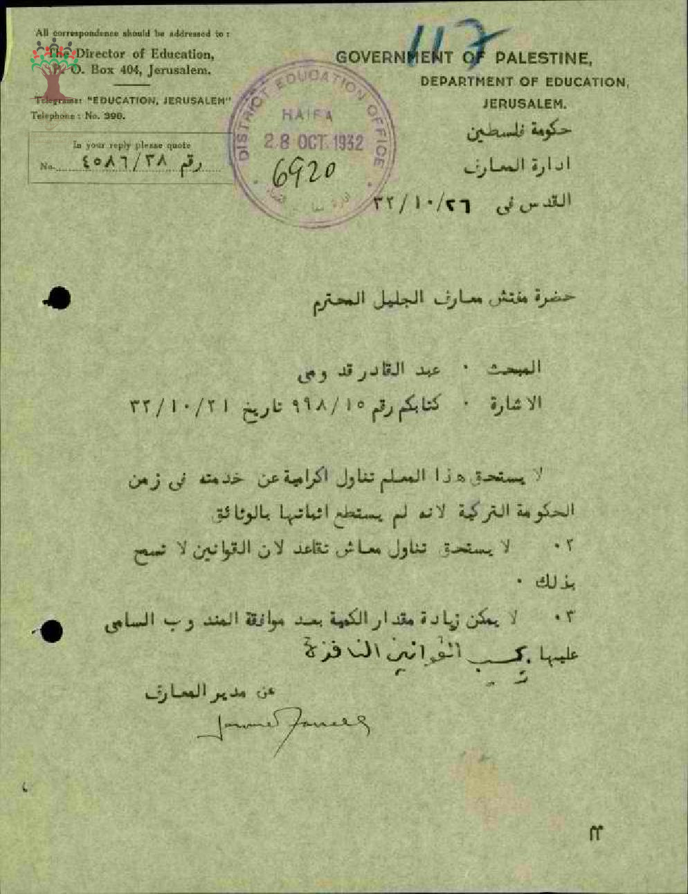 رسالة من مدير المعارف الى مفتش المعارف بخصوص عدم امكانية اعطاء المعلم عبد القادر قدومي اكرامية عن عمله زمن الحكومة التركية لأنه لم يستطع اثباتها بالوثائق