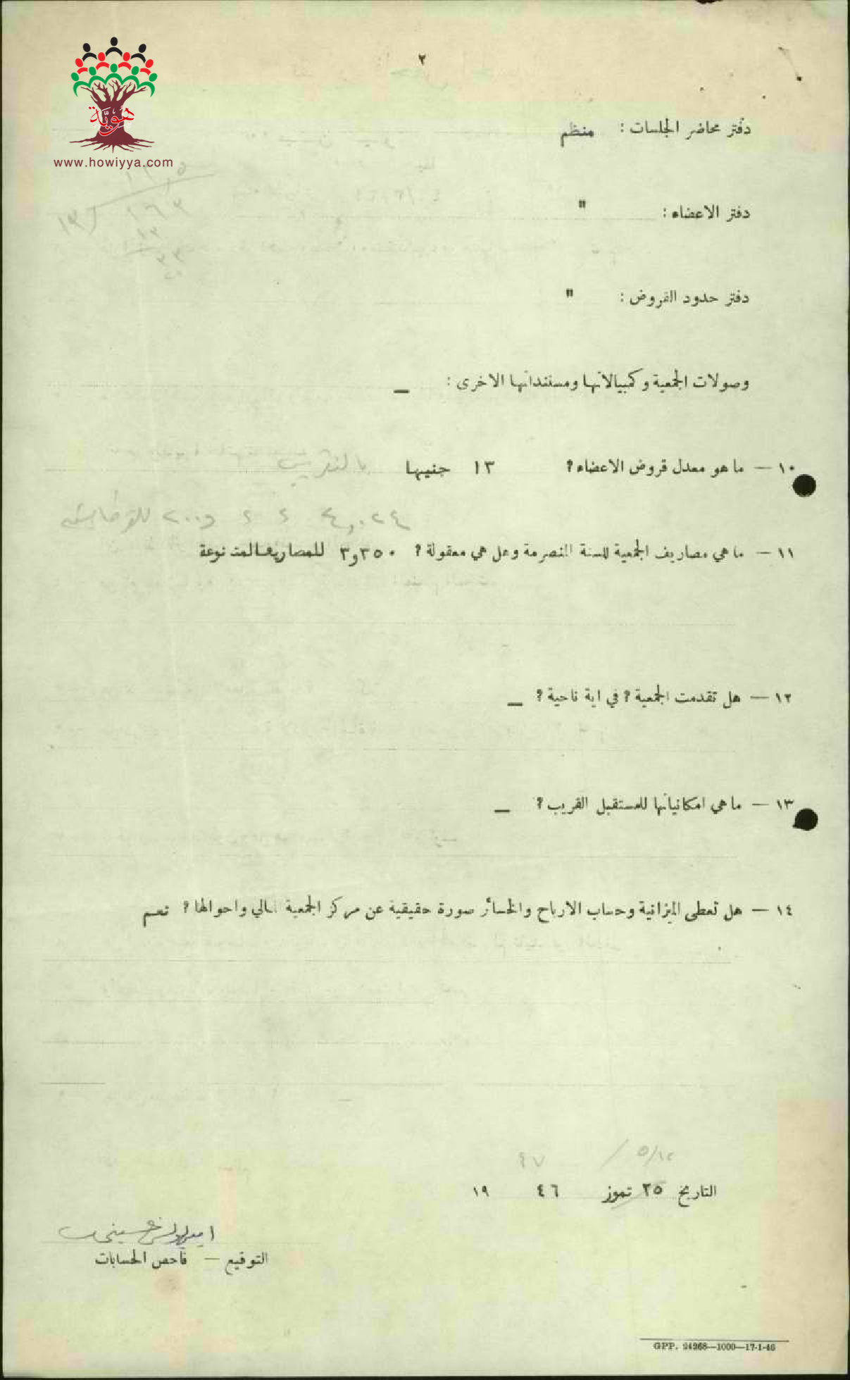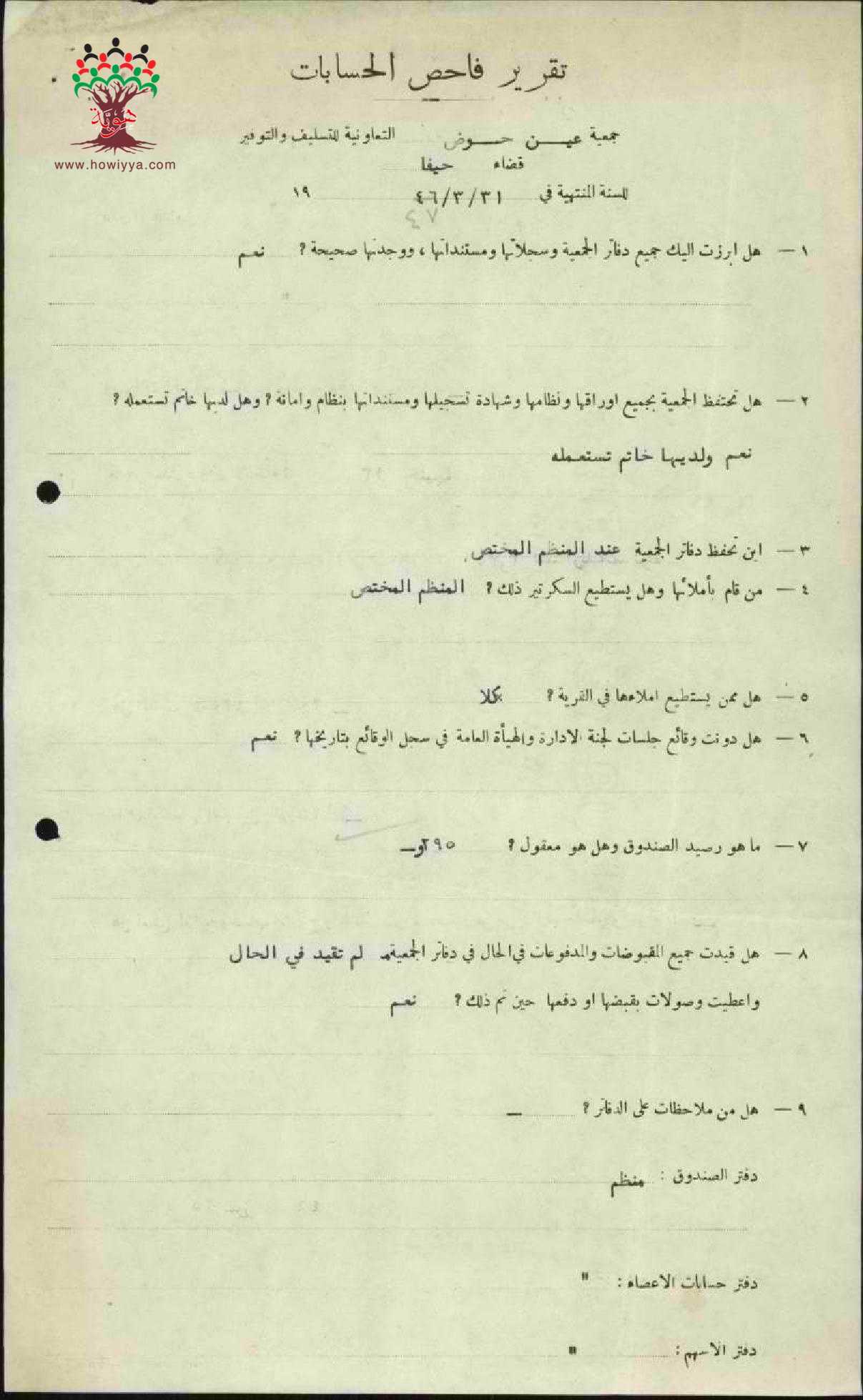 تقرير فاحص الحسابات لجمعية عين حوض 1946