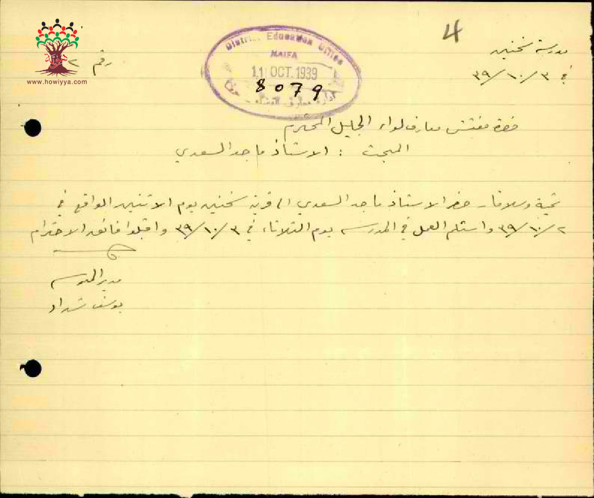 رسالة من مدير مدرسة سخنين الى المفتش العام عن حضر المعلم ماجد السعدي - عكا