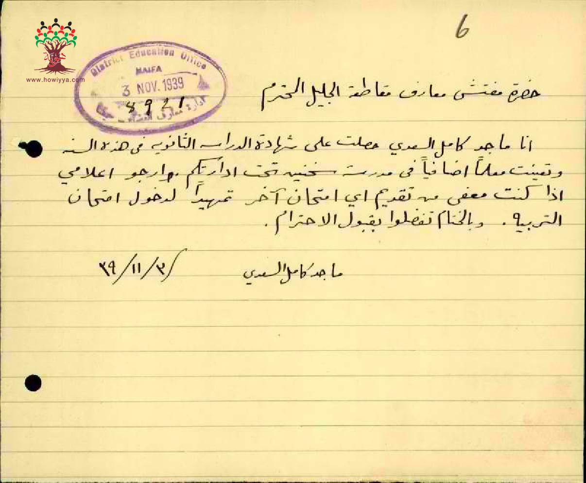إخبار المعلم ماجد السعديالمفتش العام عن حصوله على الشهادة الثانوية - عكا - مدرسة سخنين
