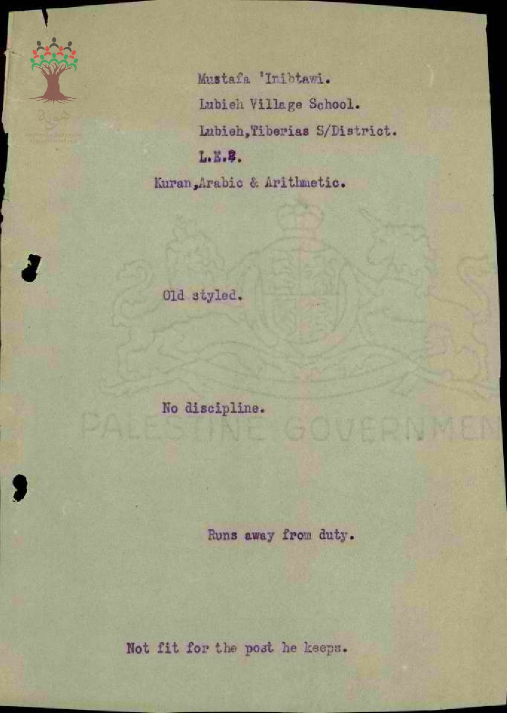تقرير عن أداء المعلم مصطفى عنبتاوي في مدرسة لوبيا سنة 1922