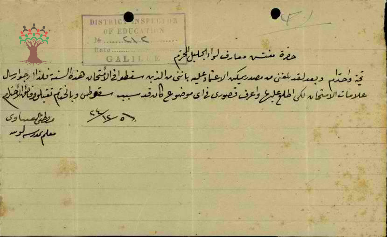 رسالة من المعلم مصطفى عنبتاوي الى مفتش المعارف يطلب علاماته في امتحان المعلمين سنة 1924
