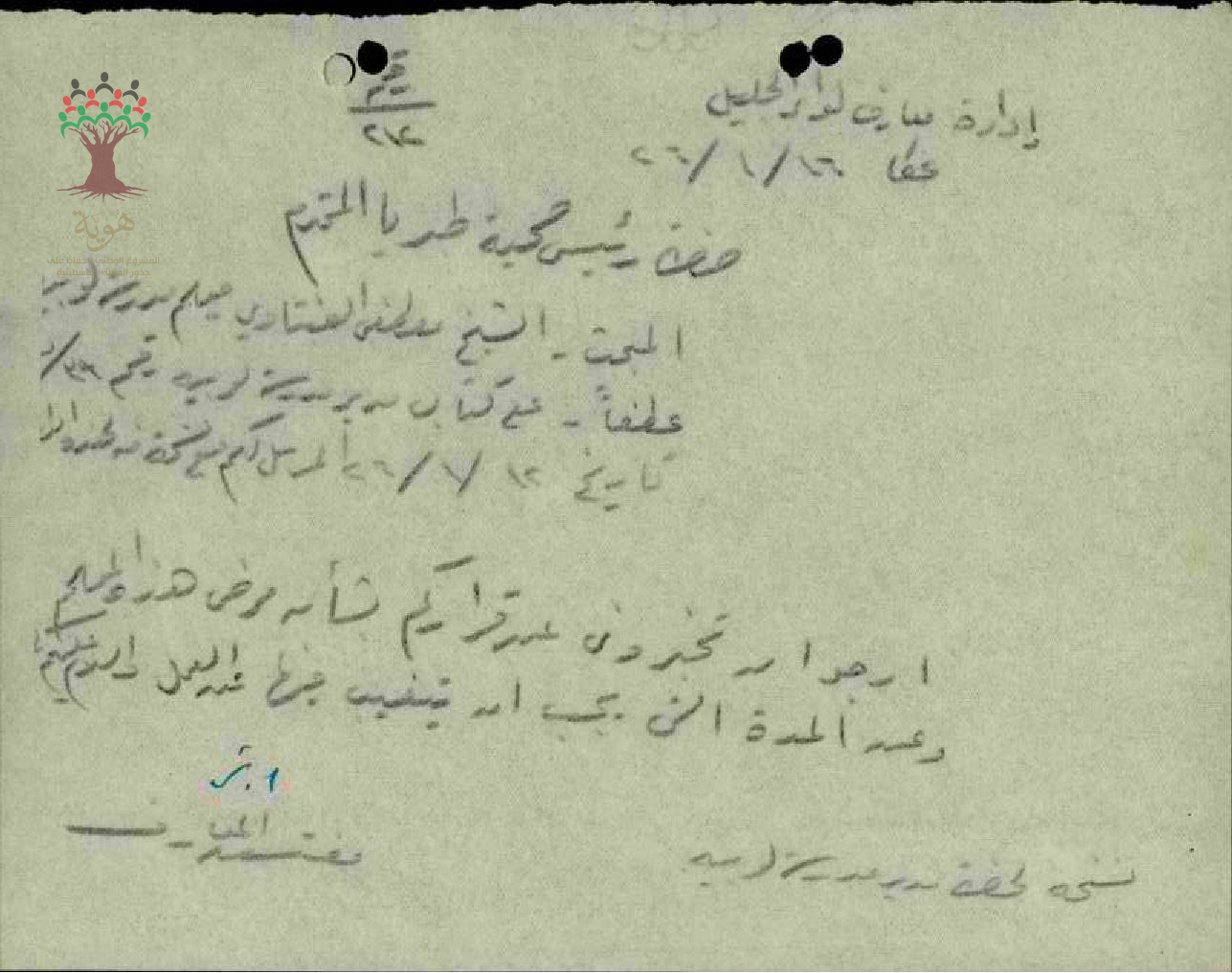 رسالة من مفتش المعارف الى رئيس صحية طبريا يسأل عن صحة المعلم مصطفى عنبتاوي