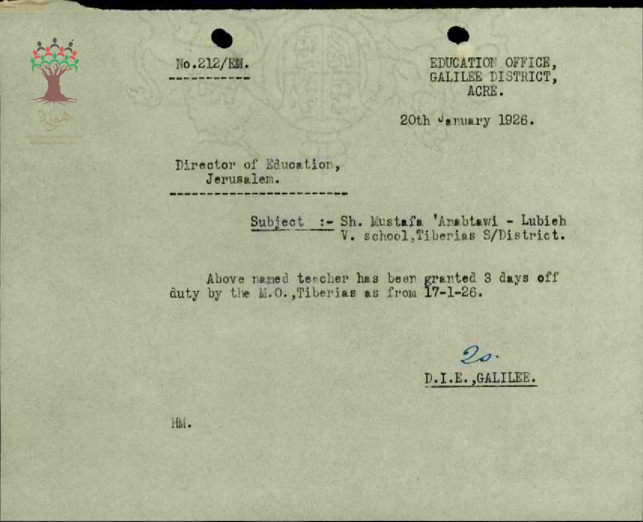 رسالة من مفتش المعارف الى مدير المعارف بخصوص اجازة مرضية للمعلم مصطفى عنبتاوي