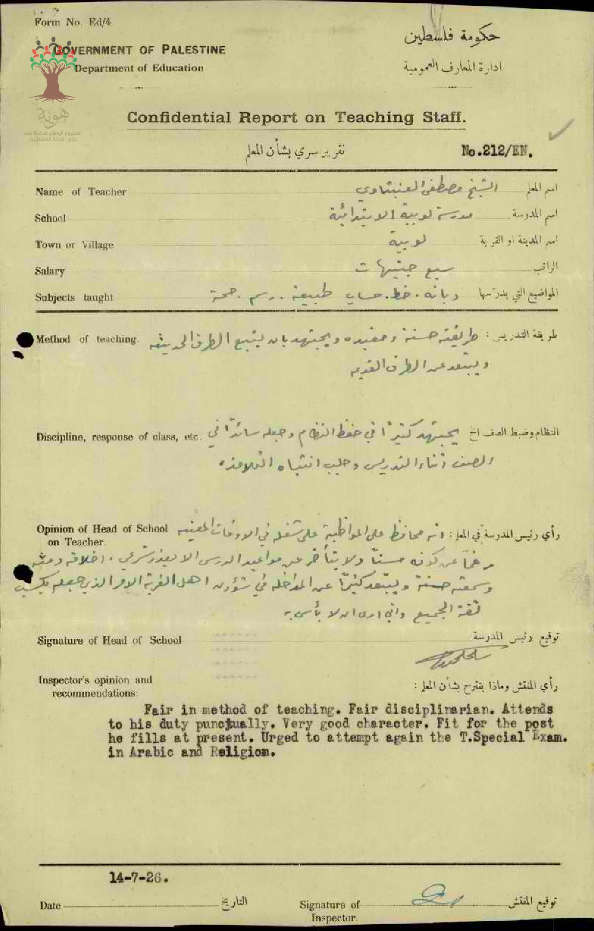 تقرير تفصيلي عن أداء المعلم مصطفى عنبتاوي في مدرسة لوبيا الابتدائية سنة 1926