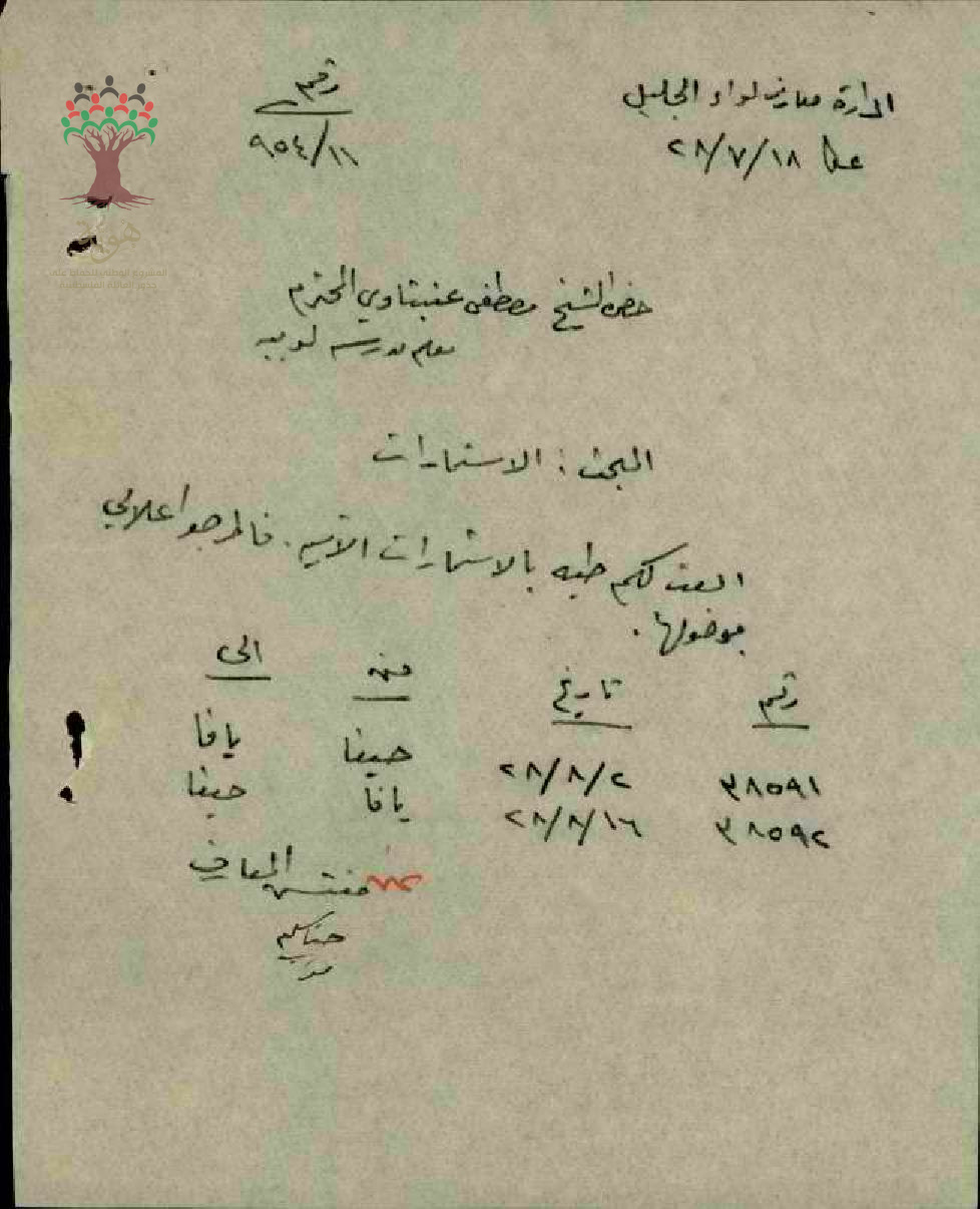 رسالة من مفتش المعارف الى المعلم مصطفى عنبتاوي مرفقة باستمارة سفره